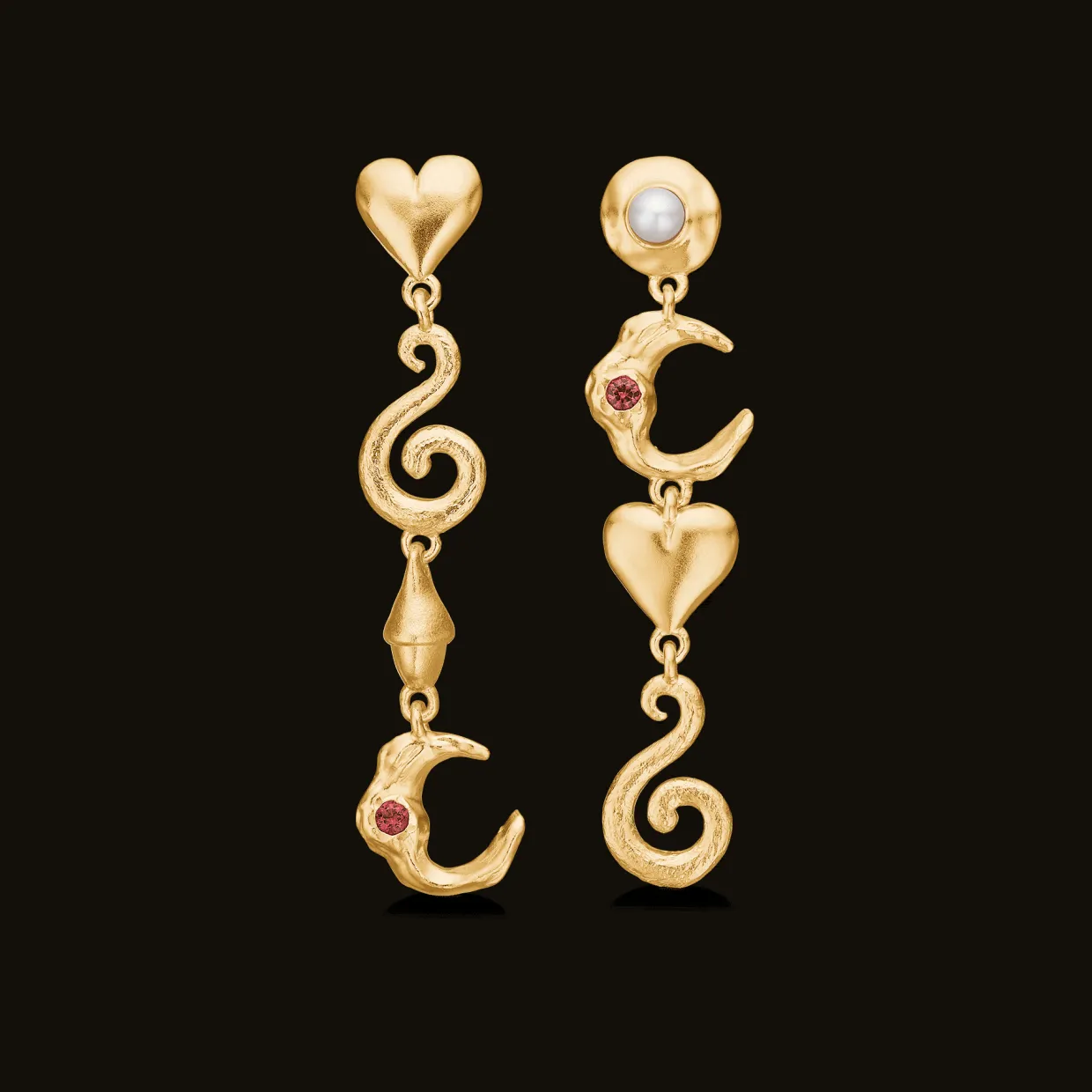 Fuldend dit look med de magiske Cascade øreringe fra Studio Z, der kombinerer hjerter, snirkler, måner og perler i et harmonisk og himmelsk design. Den ene ørering prydes af en elegant perle, mens den anden har et unikt agern, hvilket skaber en smuk asymmetri. Med detaljer som en rød zirkonia og måne, tilføjer disse øreringe en farverig og naturlig elegance til enhver lejlighed. Perfekte til at udtrykke din personlige stil med et unikt, celestial twist!