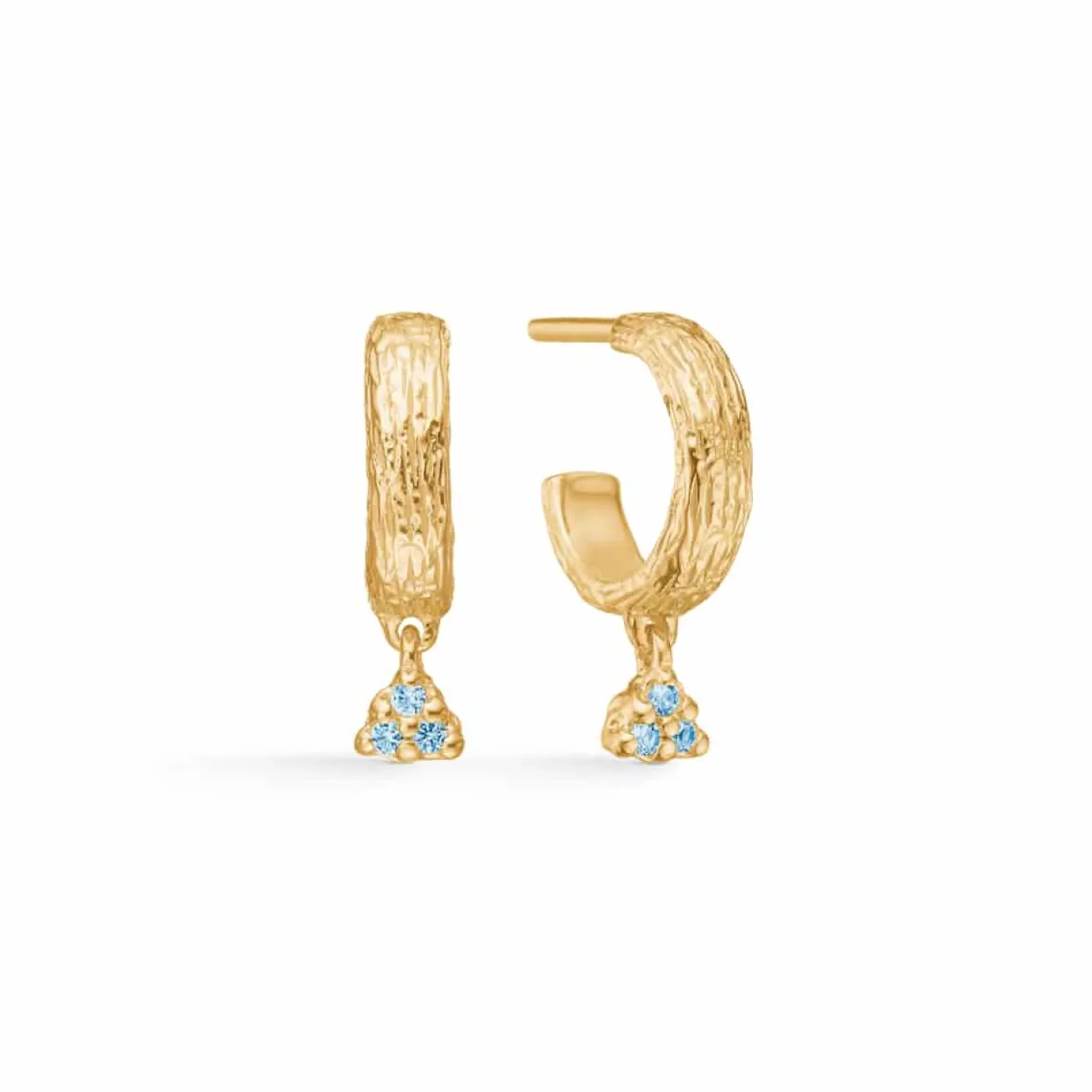 Smukke øreringe fra Studio Z i 925 sterling sølv belagt med 18 karat guld og måler 20 mm. Øreringene er designet med inspiration fra naturen og kan ses ved de unikke former. Elegance, betagende og himmelske beskriver øreringene med få ord og de blå zirkonia sten er med til at fuldende looket, der kan bæres til alle anledninger.