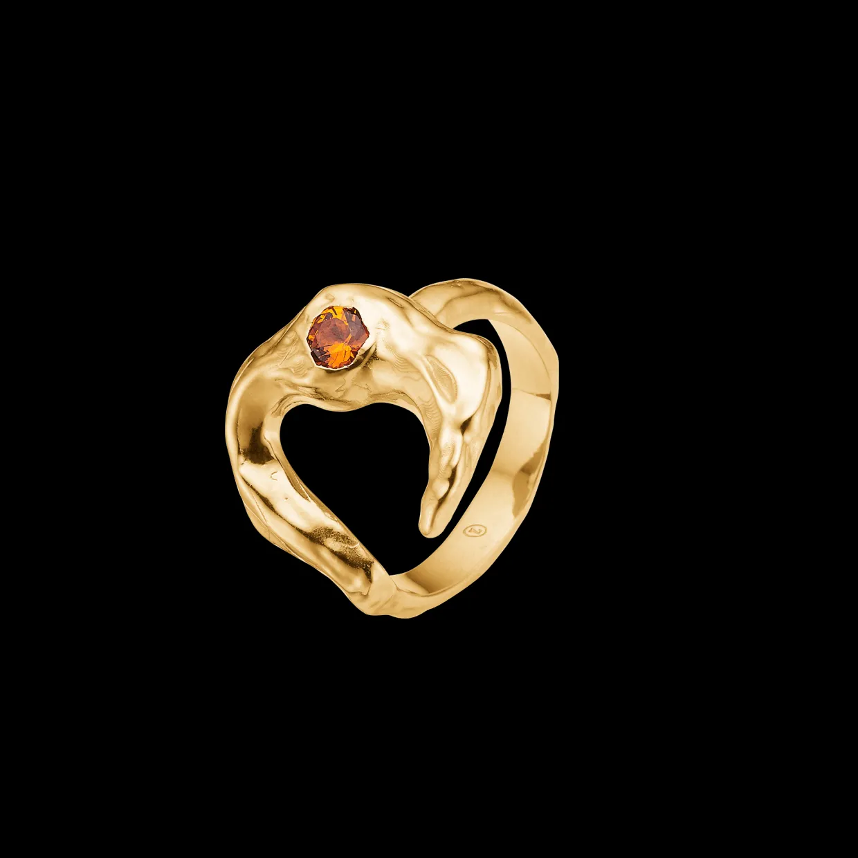 I ringen sidder en måne med hamret overflade, hvori der sidder en orange zirkonia sten.