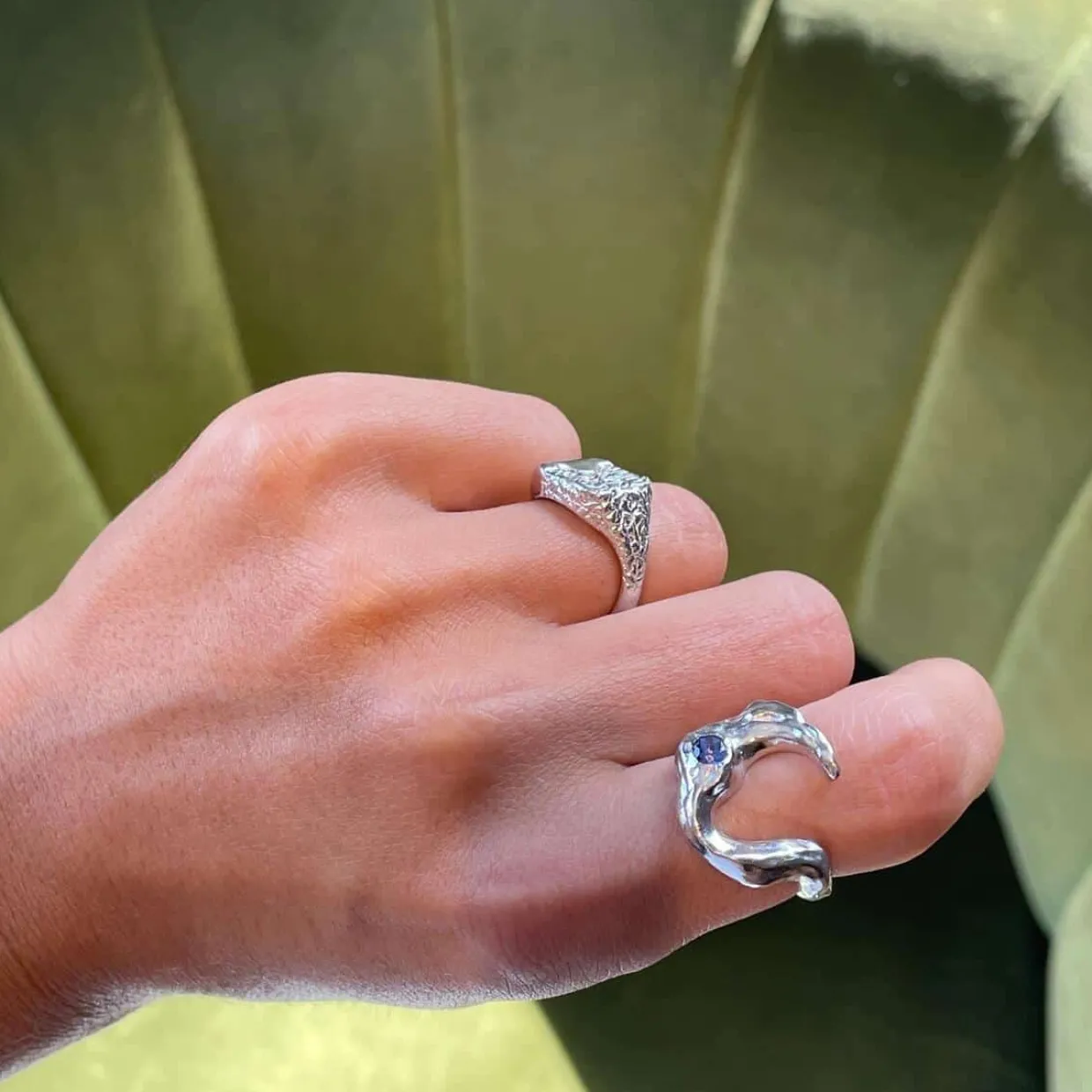 Ringen er prydet med en hamret måne, hvori der sidder en blå zirkonia.