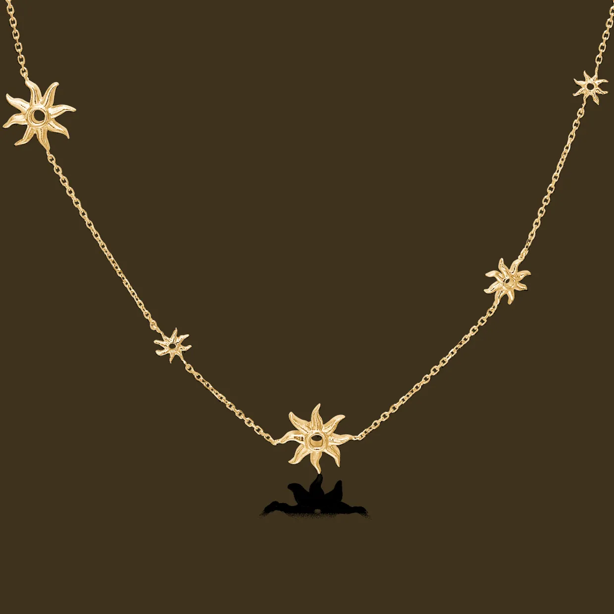 Smuk sølv forgyldt halskæde hvor der sidder små sole på selve kædestykket.