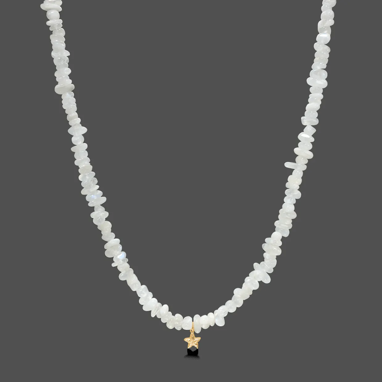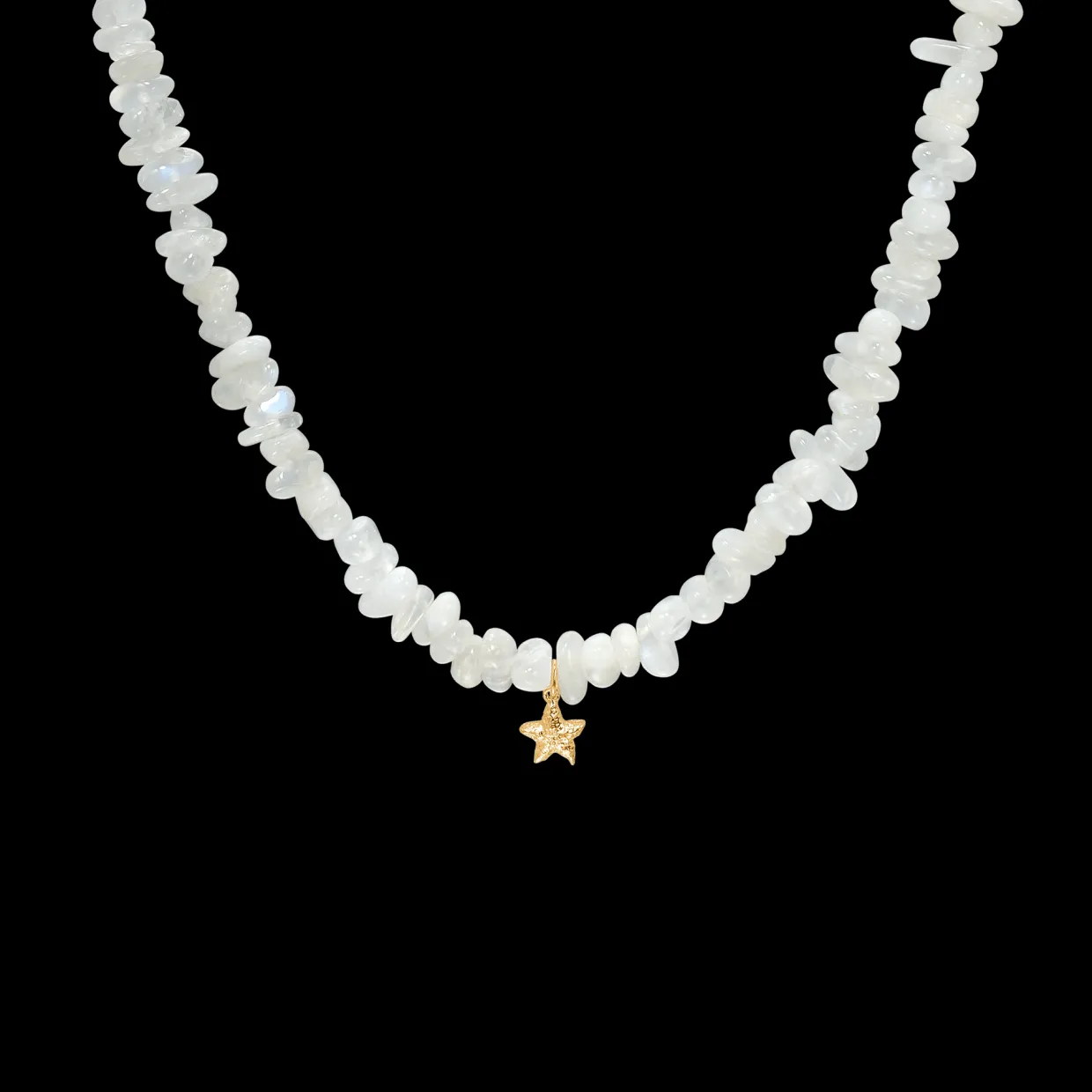 Utrolig smuk halskæde med små fine hvide månesten samt en forgyldt charm i midten, en lille søstjerne som symboliser alt ved stranden og havet. Perfekt halskæde til sommerkjolen.