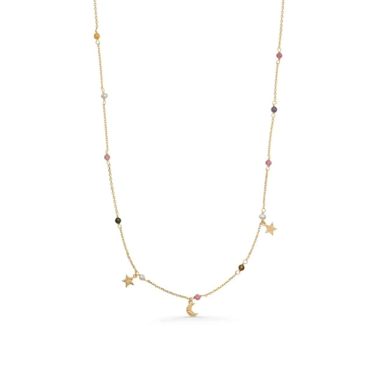 Sølv forgyldt halskæde med sten og perle. Halskæde er fra serien STARLIGHT hvor der også findes et armbånd til. Halskædens mønster er rund anker hvor sten og perler sidder med mellemrum plus stjerner og måne.