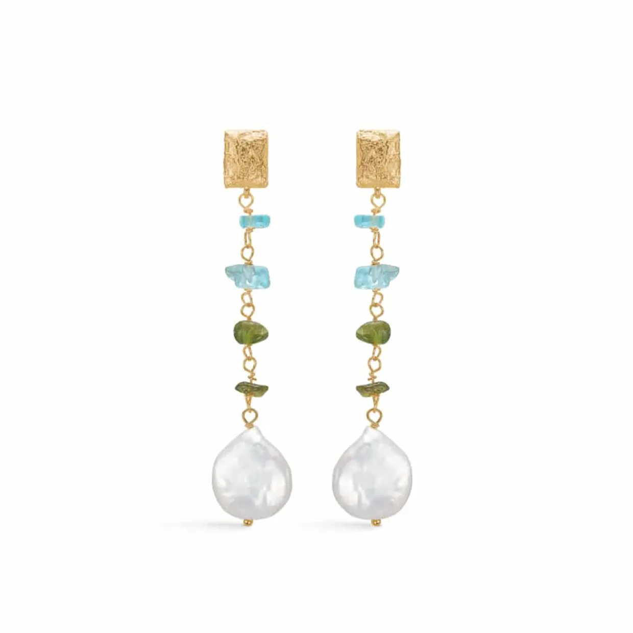 Sølv forgyldt øreringe med sten og barok perle. Øreringene som hænger er fra serien TWILIGHT. Øreringe er på stik som sidder i firkanten derefter kommer der to lyseblå sten og to grønne og så er øreringen sluttet af med den barokke perle.
