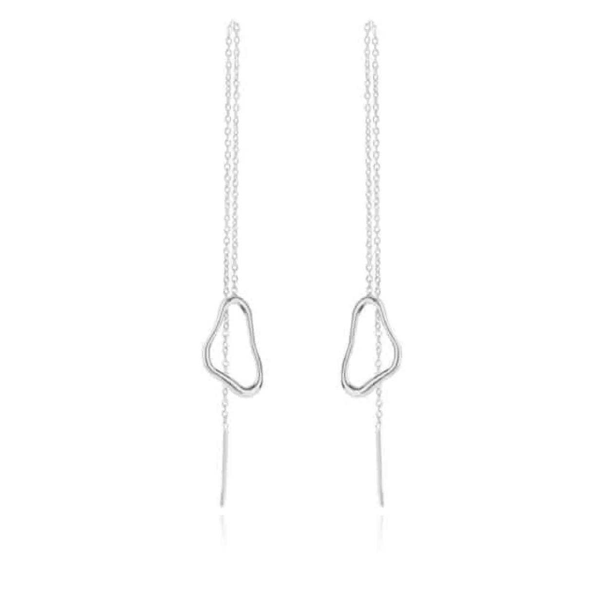 Smukke øreringe fremstillet i sterling sølv som er blankt i overfladen. Øreringene er designet som en kæde du trækker igennem øret. For enden af kæden er det er åben cirkel i organiske former.