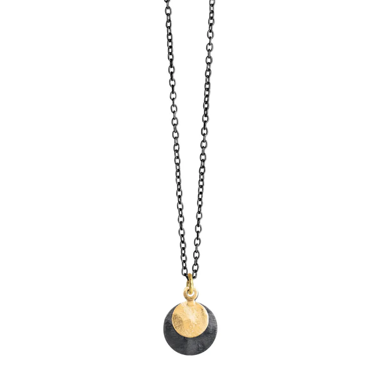 Sølv oxyderet halskæde med vedhæng som to mønter. Mønterne er den ene sølv oxyderet på 12 mm og den sølv forgyldte på 8 mm. Kæden har en længde på 45 cm.