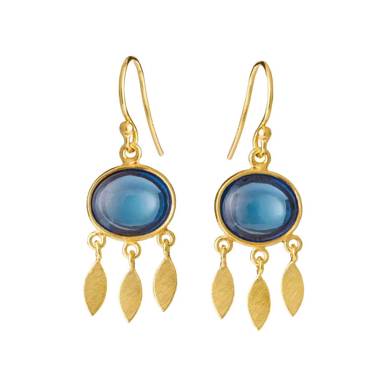 Øreringene er lavet i 925 sterling sølv, som er blevet forgyldt. Stenen er en cabochon formet london blue krystal.