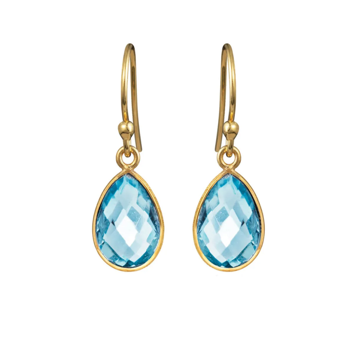 Elegante ørehængere i forgyldt sølv med en dråbeformet, syntetisk blå topas. Stenene måler 8 mm i bredden og 12 mm i højden. Den blå farve er super smuk og går rigtig fint til det gyldne sølv