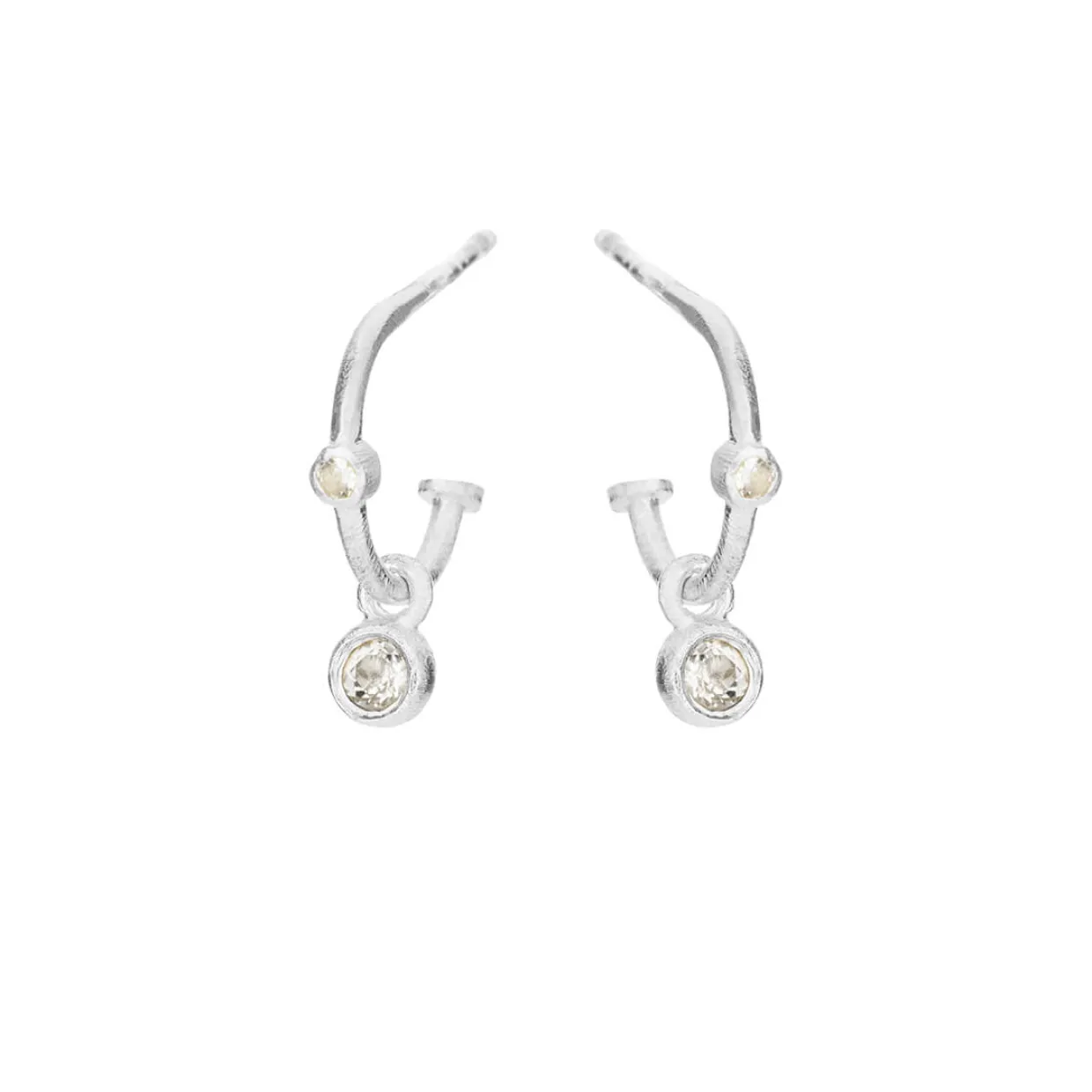 Disse søde øreringe er fremstillet i sterling sølv og er børstet i overfladen. Øreringene er designet som creoler som måler 10 mm i diamater. Creolerne har små hvide topaz hængende fra.