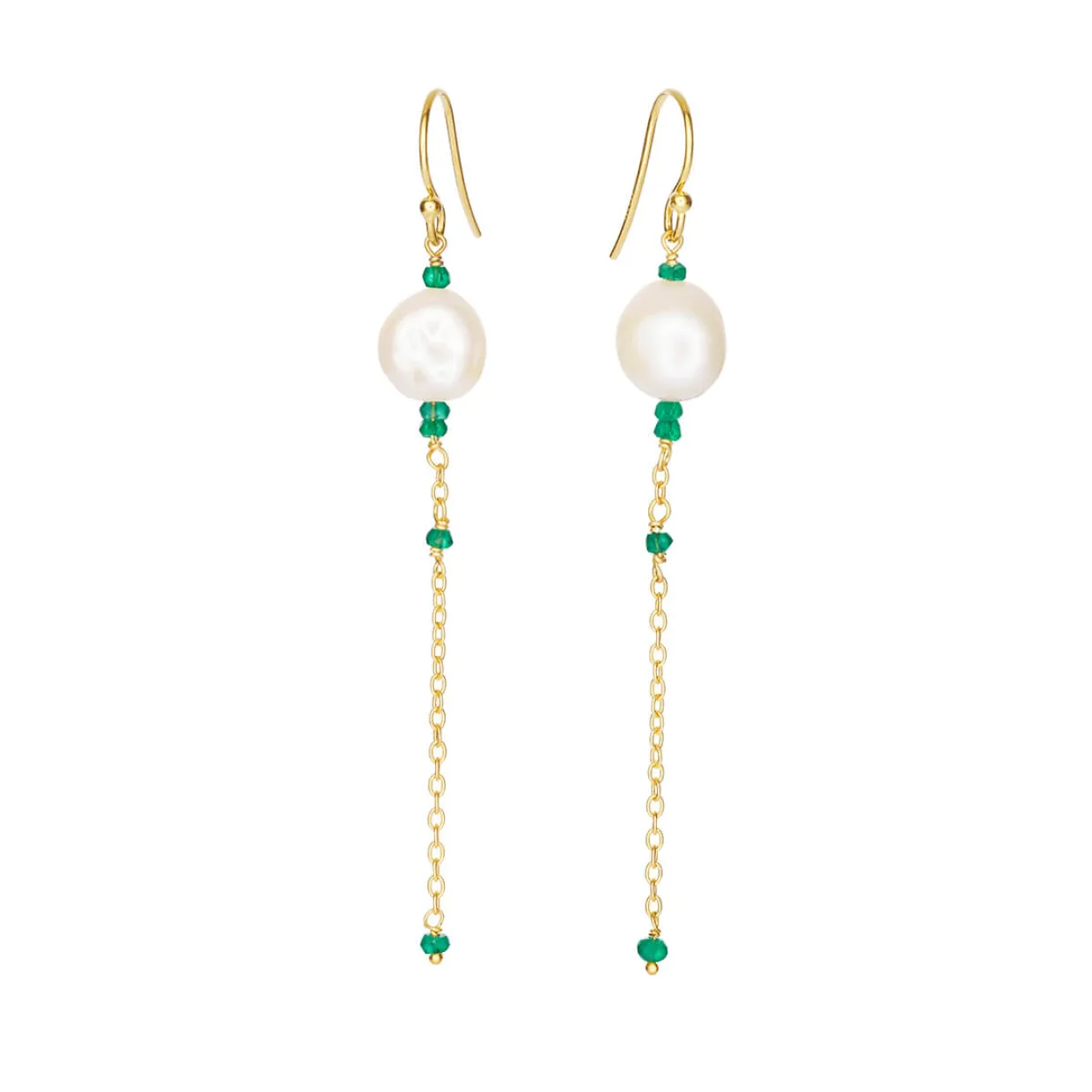 Disse skønne øreringe er fremstillet i guldbelagt sterloing sølv og er designet som ørehængere. Fra ørebøjlen hænger en kæde som måler 7 cm og har i sat hvide ferskvands perler og små grønne agat stene i facet slib.