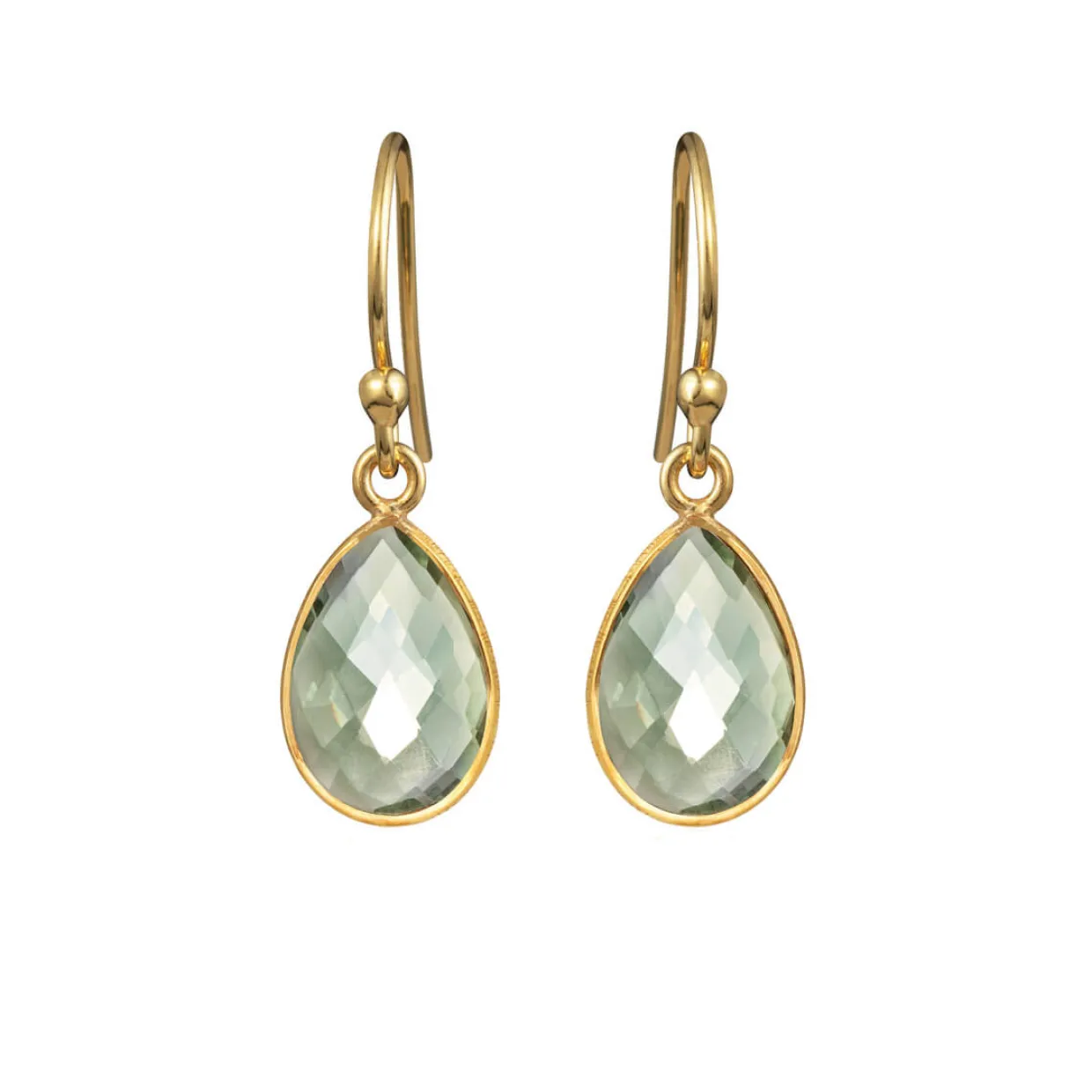 Disse flotte øreringe er fremstillet i guldbelagt sterling sølv og er designet som ørehængere. Øreringene har facetslebne grønne kvarts stene hængene fra, som måler 8×12 mm.