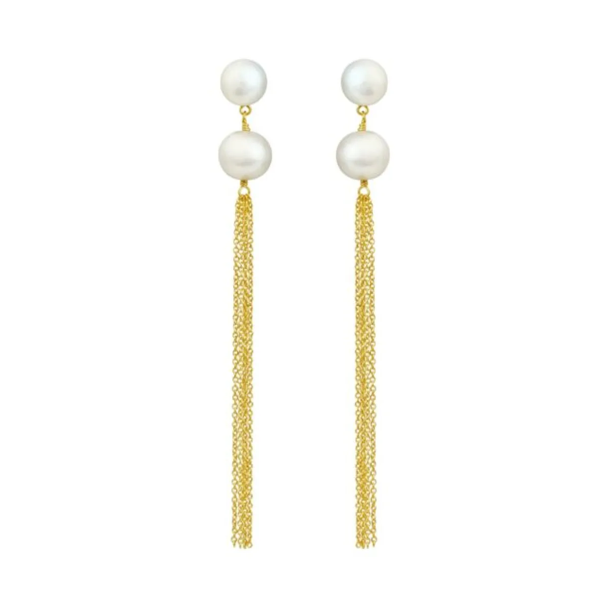 Smukke perle ørehængere med vifte af kæder, øreringene giver en flot fylde på øret samt en nymoderne måde at bruge perlen på.