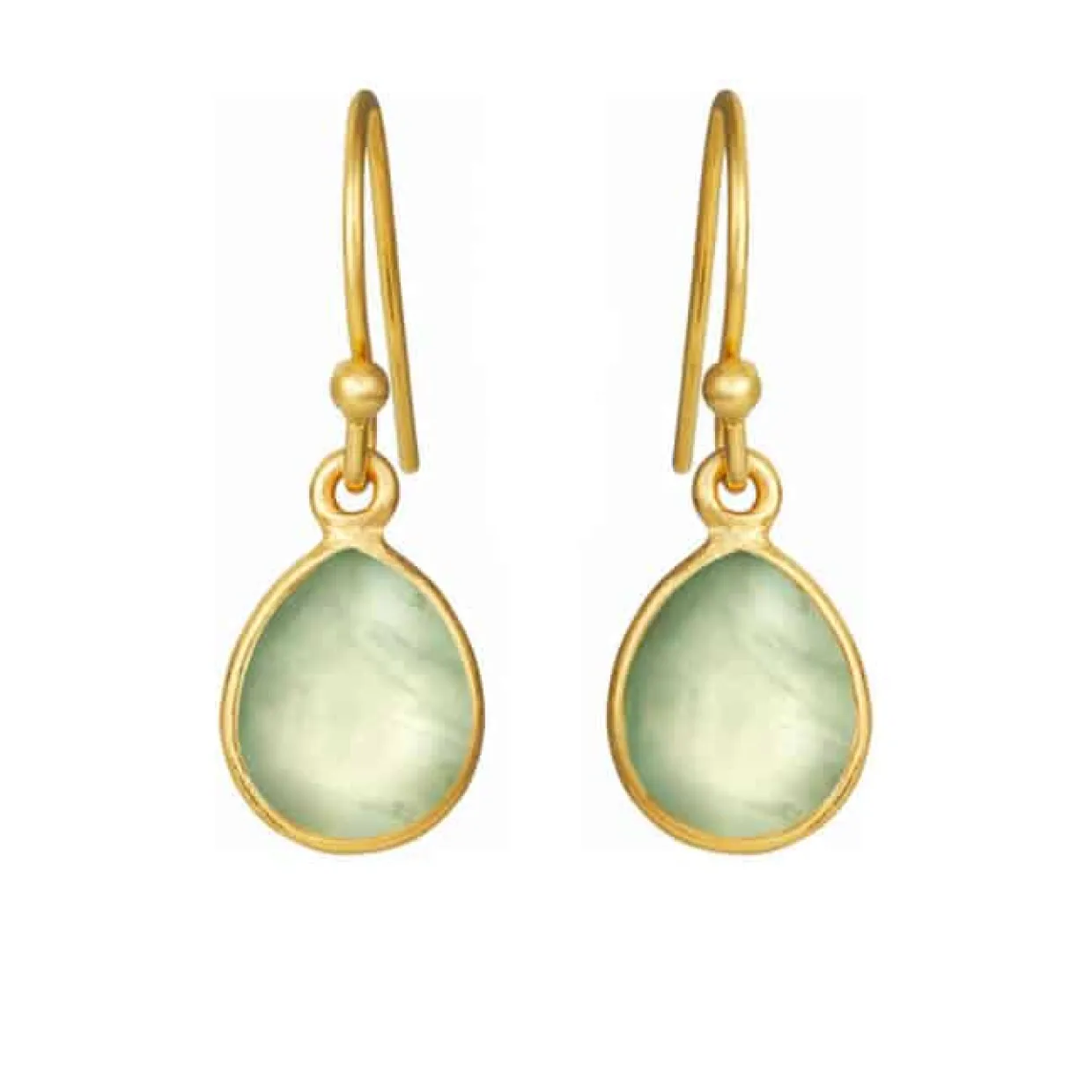 Elegante øreringe i guldbelagt sterling sølv. Øreringene er designet som ørebøjler med en dråbeformet, grøn prehenit sten.