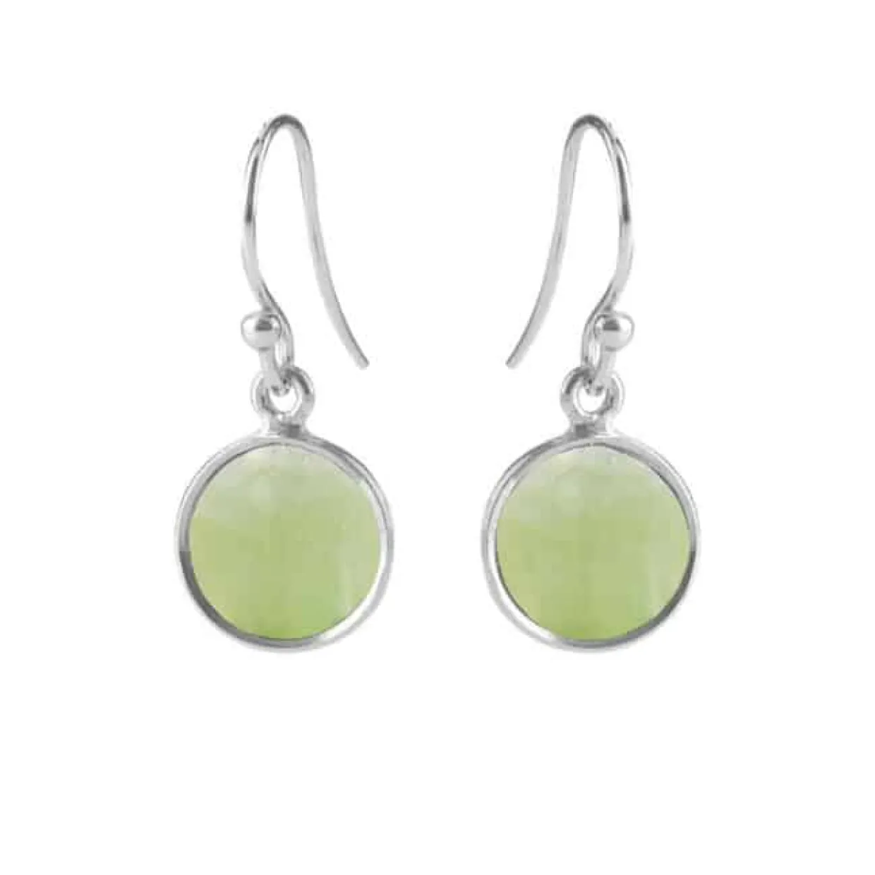 Fine øreringe i sterling sølv designet som ørebøjler. Ørebøjlerne er sat med runde, cabachon formede prehnite som måler 10mm i diamater.