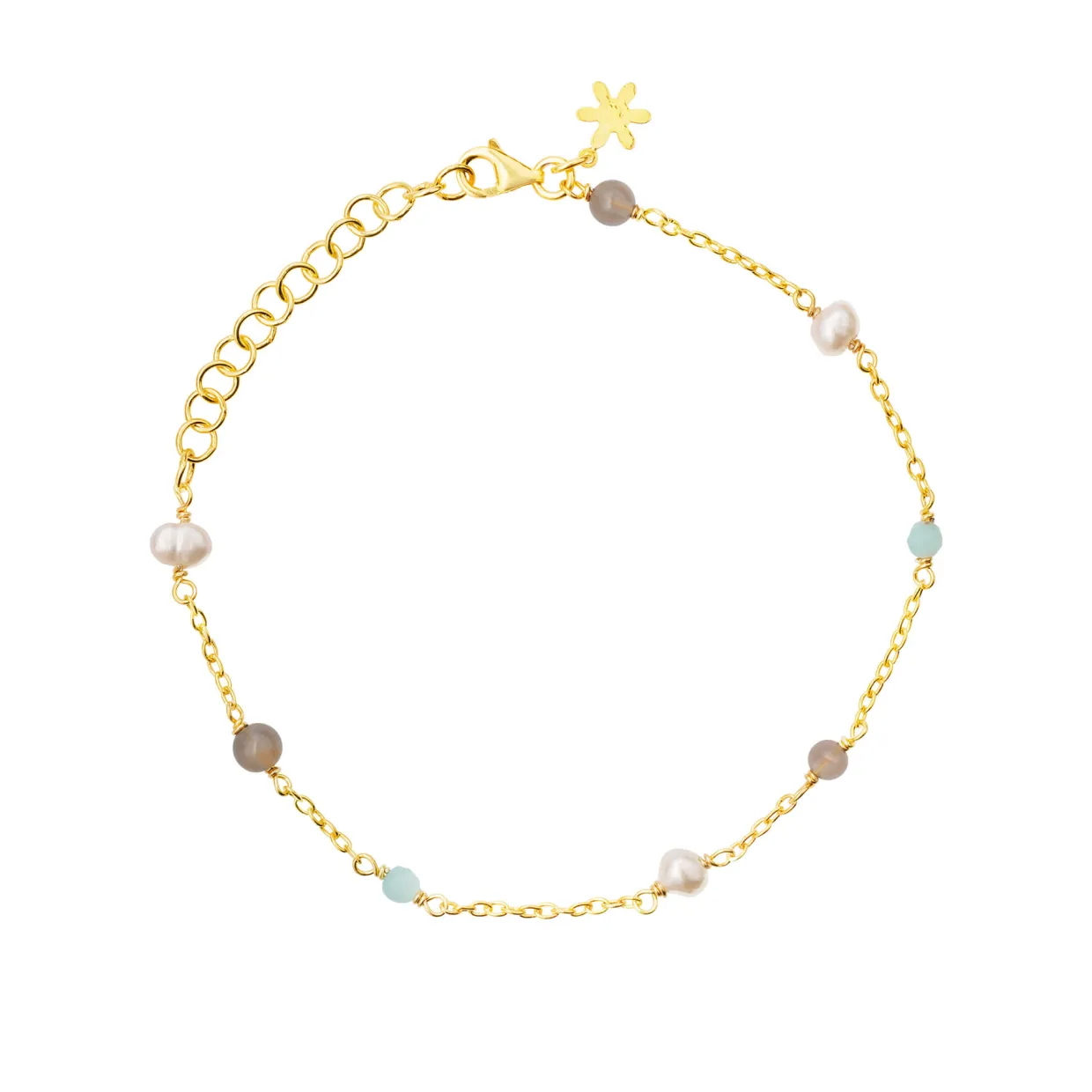 Flot sølv forgyldt armbånd med amazonite, grå månesten og hvid ferskvandsperle perle.