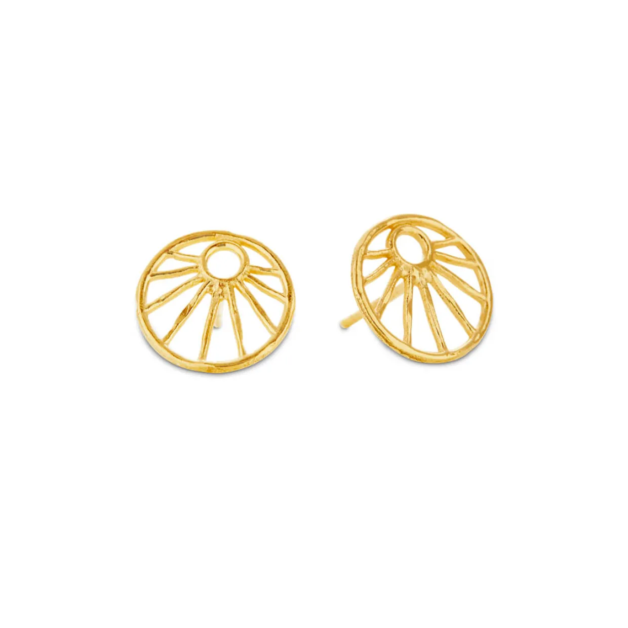 Sølv forgyldt øreringe på stik med et tråde mønster. Mønsteret er inspireret af solen og har en diameter 12 mm så de fylder godt på øret.