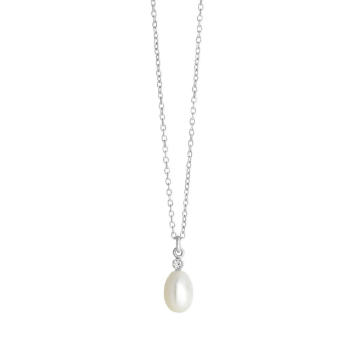 Smuk sølv halkæde med en ferskvandsperle som holdes med en hvid topas