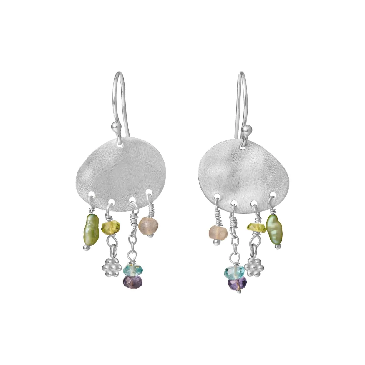 En fin boheme inspireret ørering i sølv med et mix af sten der hænger ned. Stenene består af følgende ædelsten: apatite, iolite, labradorite, peridote, indfarvet ferskvandsperler.