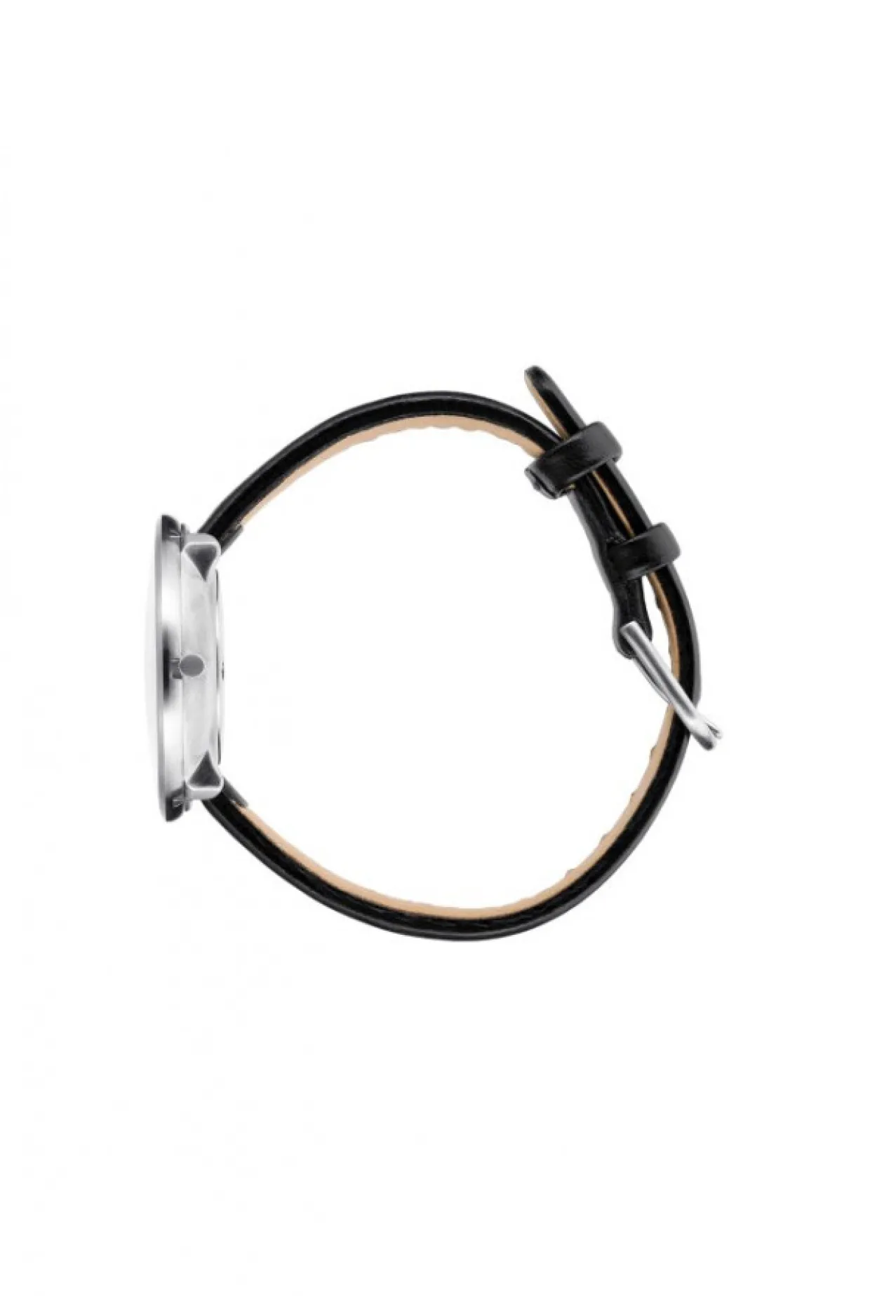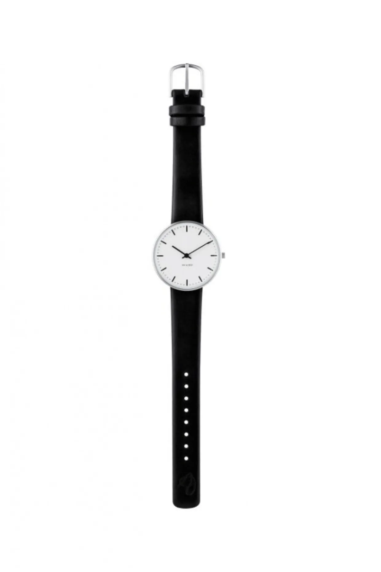 Armbåndsur 34mm urskive i mat stål med sort læderrem. Modellen fås også i 40mm urskive.