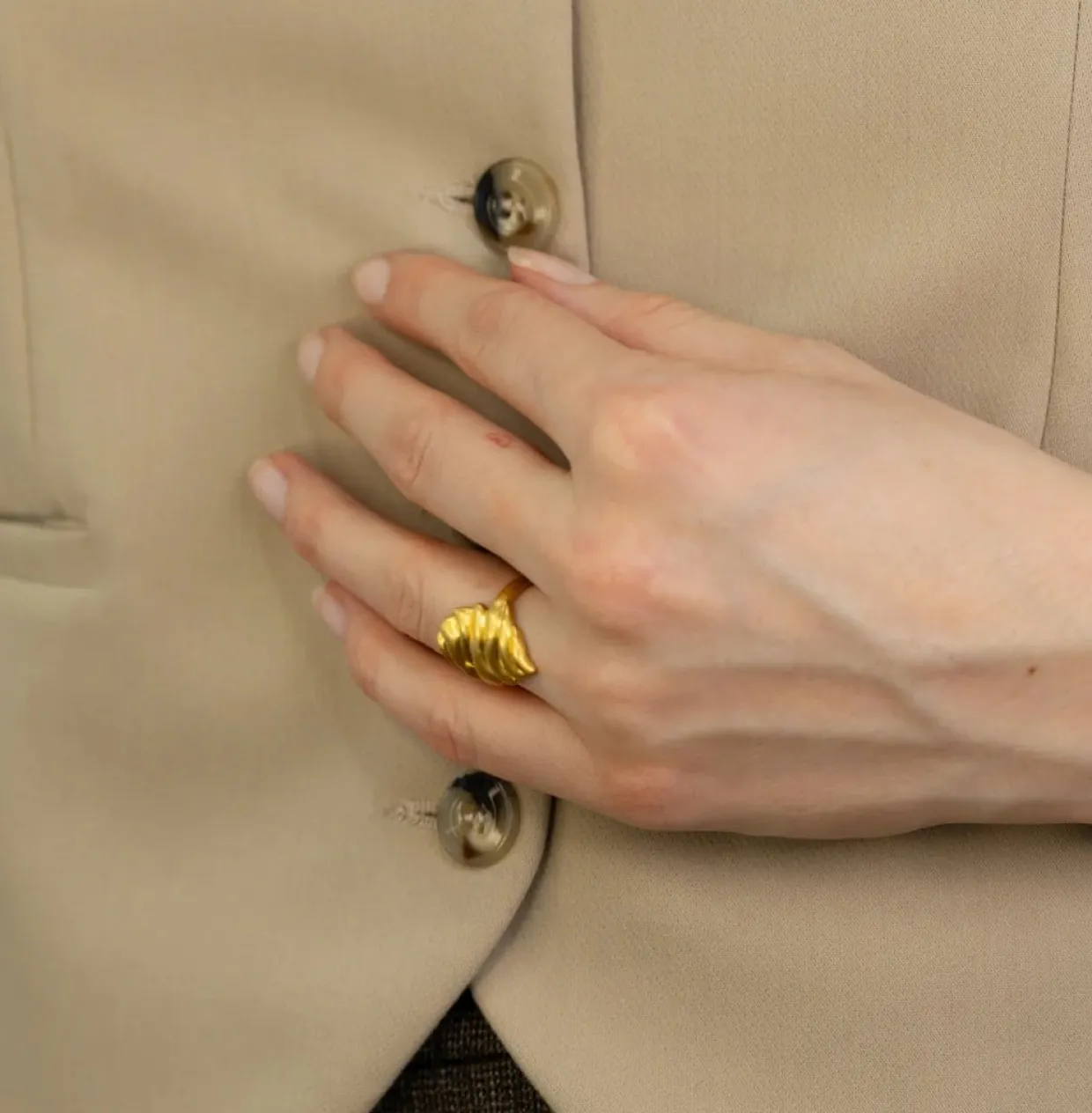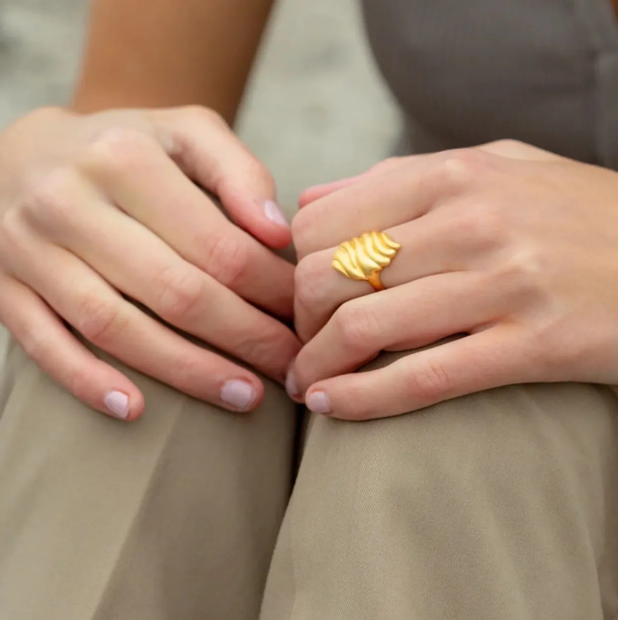 Ringen er en elegant ring designet i forgyldt sølv, inspireret af naturens organiske former. Ringen har et bølgende, sandet mønster, der symboliserer de rolige og smukke sanddyner. Den forgyldte finish tilføjer et luksuriøst touch, hvilket gør denne ring perfekt til både hverdagsbrug og specielle lejligheder. Med sin enkle, men markante stil, giver den et sofistikeret og tidløst udtryk.