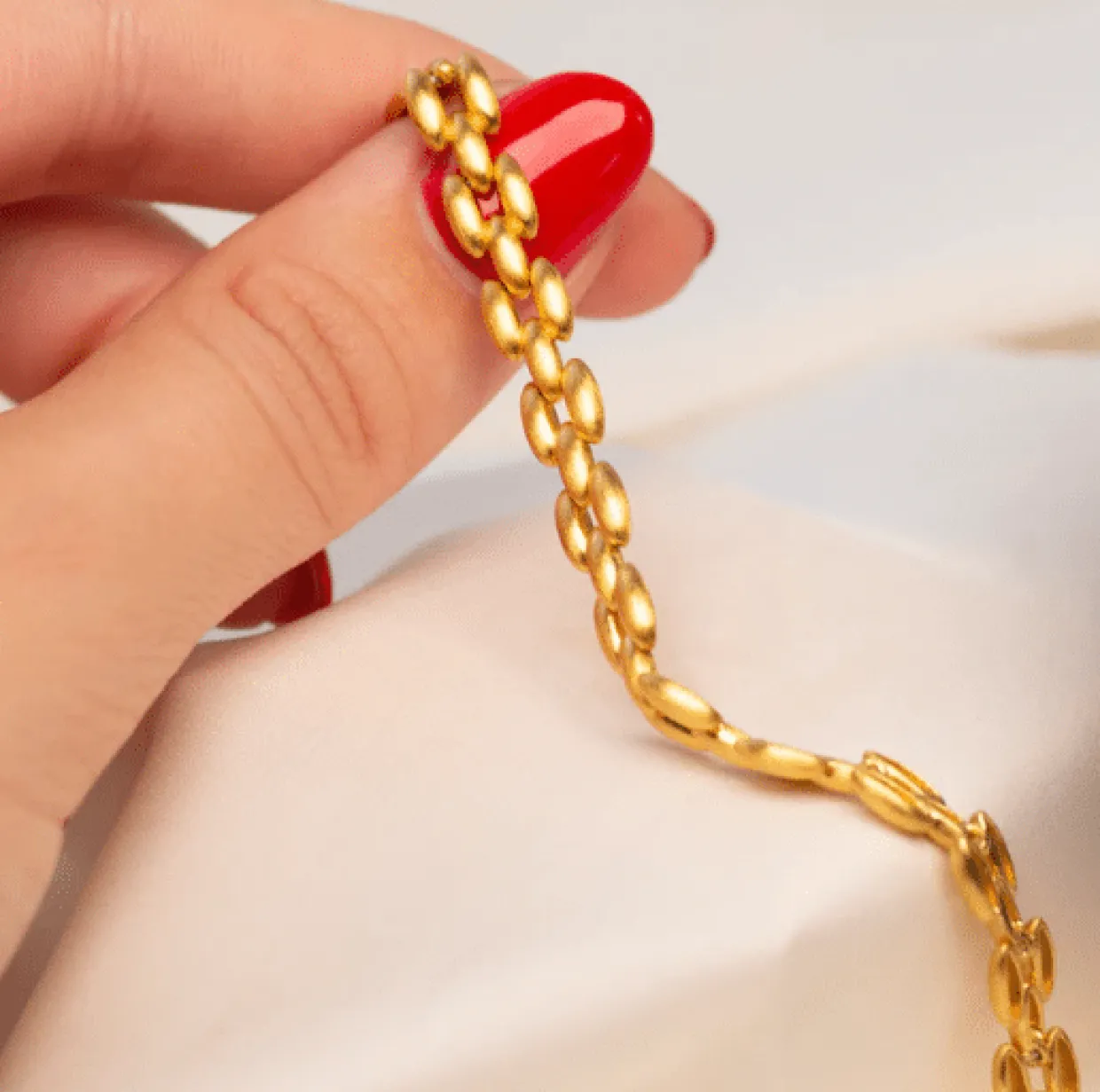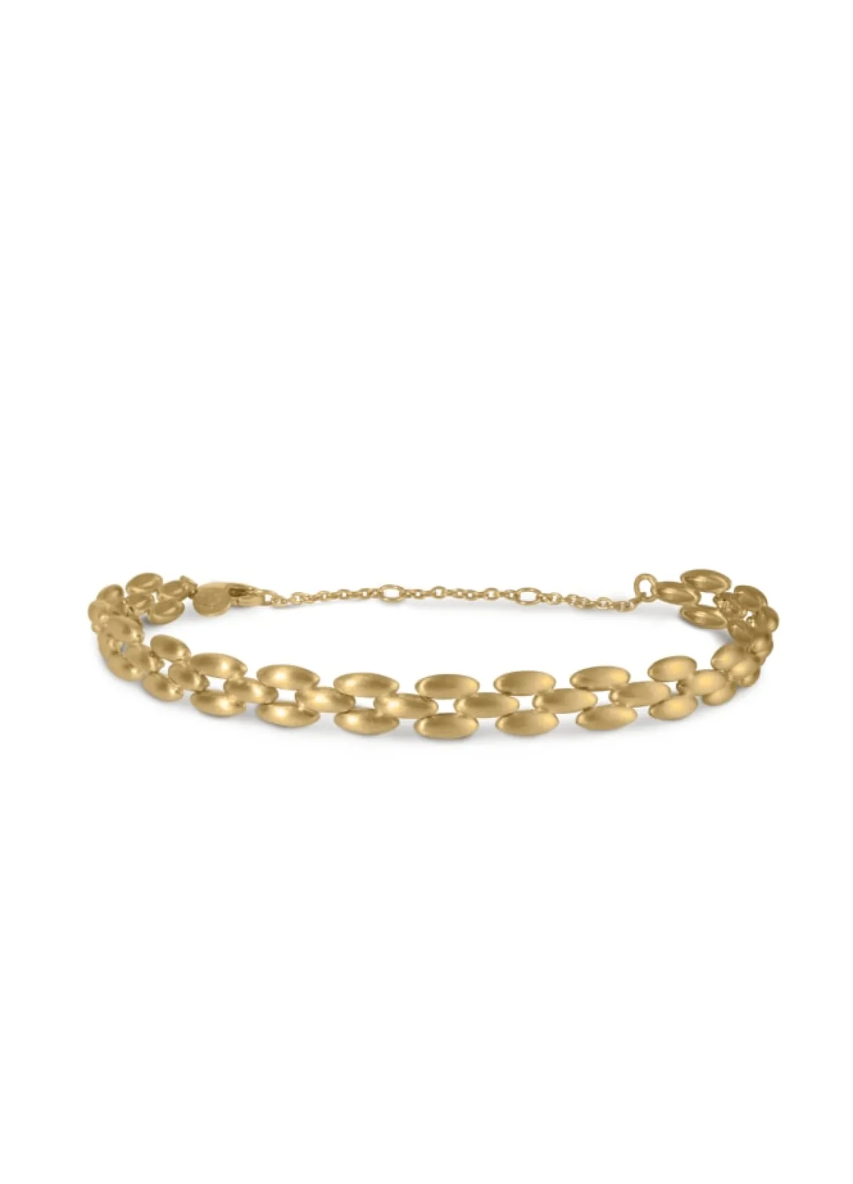 Dette armbånd er inspireret af forårs bladende på træerne, livet der pibler frem alle steder, og kæmper om pladserne i solen. Dette smukke armbånd vil passe til hver en anledning. Armbåndet er belagt med 14 KT guld og måler 19,5 cm, med mulighed for at justere størrelsen.