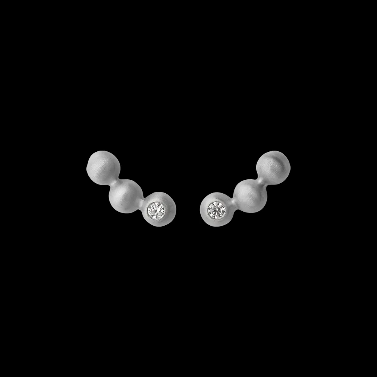 Små fine ørestikker i sterling sølv fra serien Pebbles. Ørestikkerne er udformet som 3 kugler og i den nederste sidder der en hvid syntetisk zirkonia. I serien findes både forskellige ringe, hoops og halskæder.