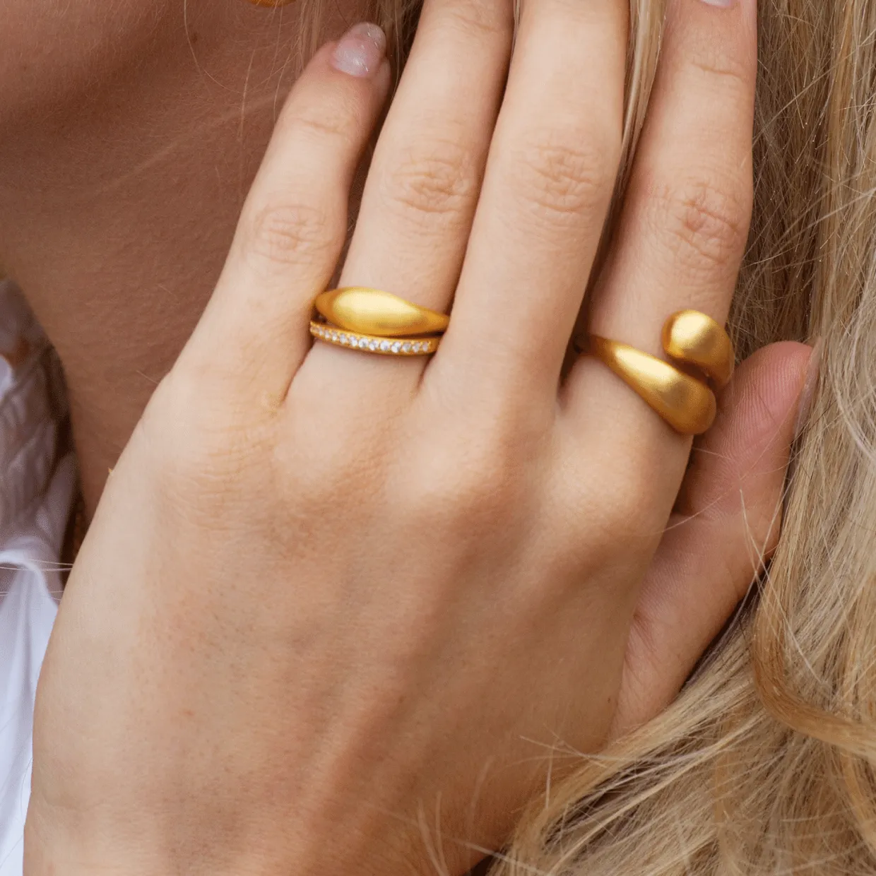Smuk og enkelt ring som giver fylde. Med sin mate overflade og runde former, giver denne ring et smukt feminint udtryk. Ringen er lavet ud af sterling sølv, der er blevet forgyldt. Ringen er en udvidelse af Ocean Flow serien, hvor der også findes andre ringe og øreringe.