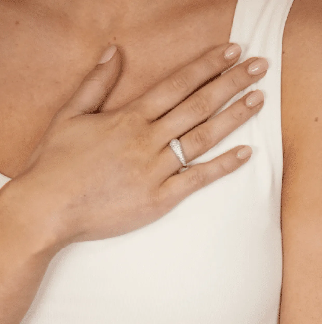 Med denne smukke og elegante ring, vil du ikke kun se godt ud til hverdag eller fest, men også være med til at fjerne 1 kg plastik fra verdens havene, for hvert solgt produkt. Dette gælder for hele ocean flow serien. Denne ring er lavet af sterling sølv. Ringen er belagt med zirkoner. Ringens helt unik form, som starter ud smal og bliver tyk på midten. Dette design er inspireret efter havets bølger. Ringen kan sammensættes med resten af Ocean flow ringene. Ringe måler 6,5 mm bred ovenpå, 2,2 mm bred i bunden og 2,8 mm høj. Ringen findes i størrelse 48-50-52-54-56-58 og 60.