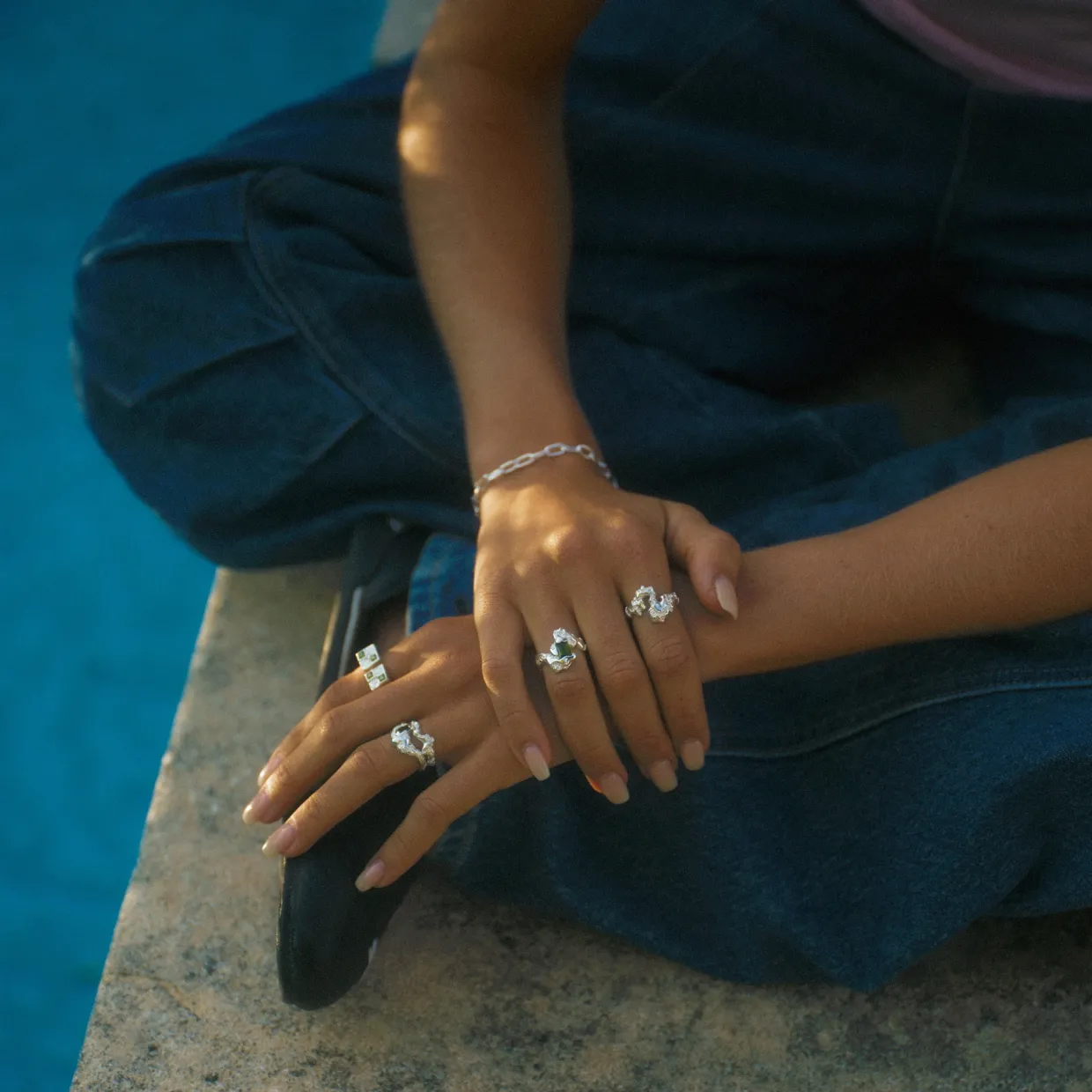 Denne eksklusive ring fra Camille Brinch er et statement-smykke, der forener rå kant med sofistikeret elegance. Big Contrast Ring er håndlavet i massivt sterlingsølv og prydet med en smuk dybgrøn syntetisk zirkonia.