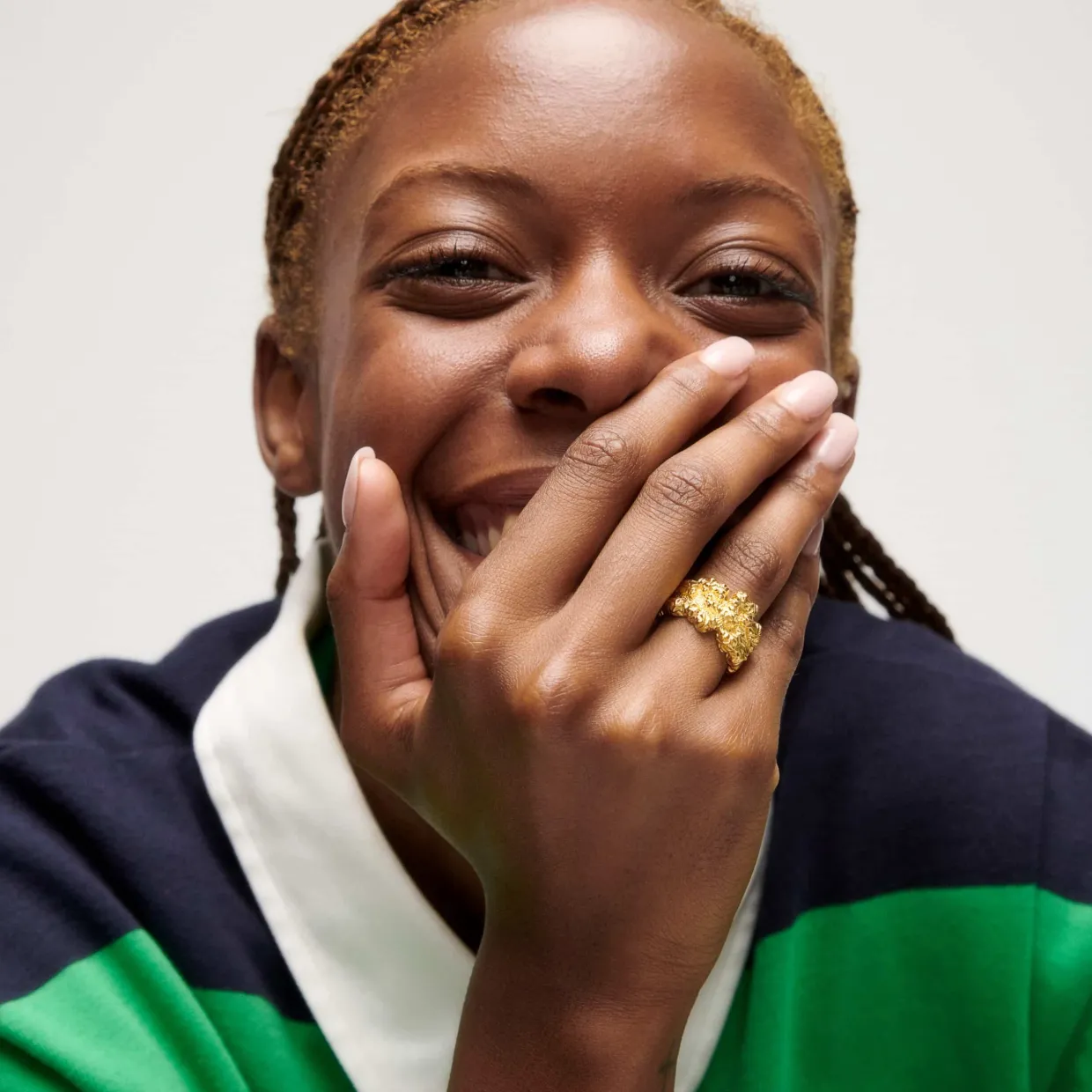 Ringen er udformet i forgyldt sølv, hvilket giver den en varm og strålende glans. Det “even bigger” design refererer til ringens størrelse og dens iøjnefaldende udtryk, hvilket gør den perfekt til den modebevidste kvinde, der ønsker at skille sig ud. Den glatte overflade og de bløde kurver giver ringen en moderne og elegant følelse.
