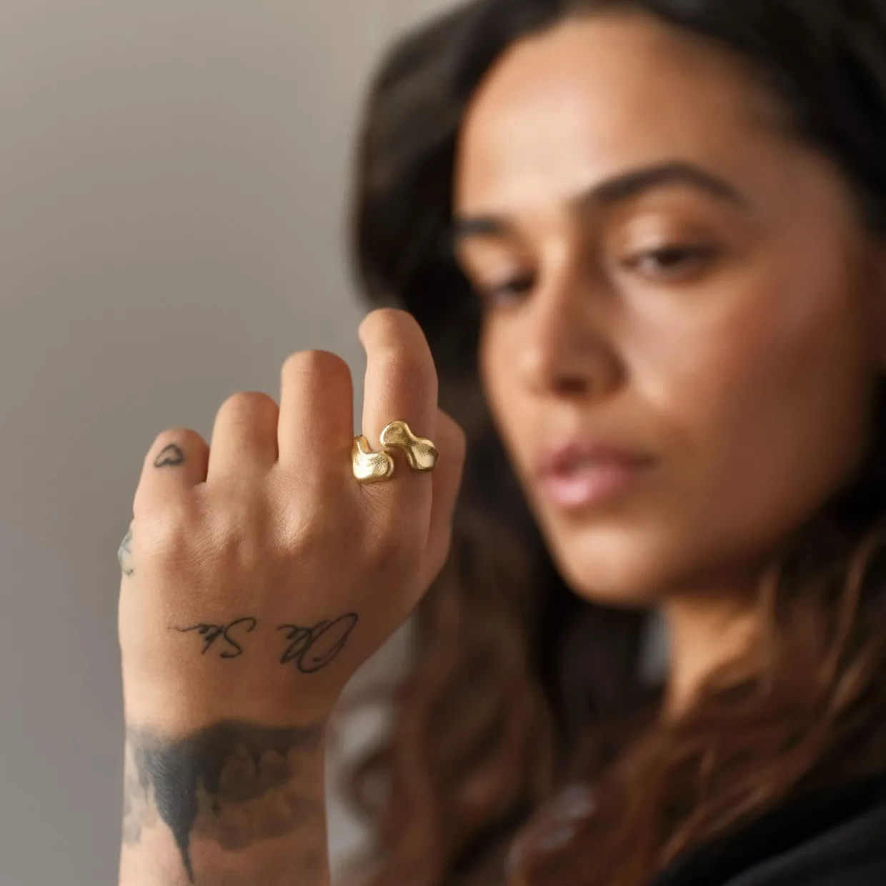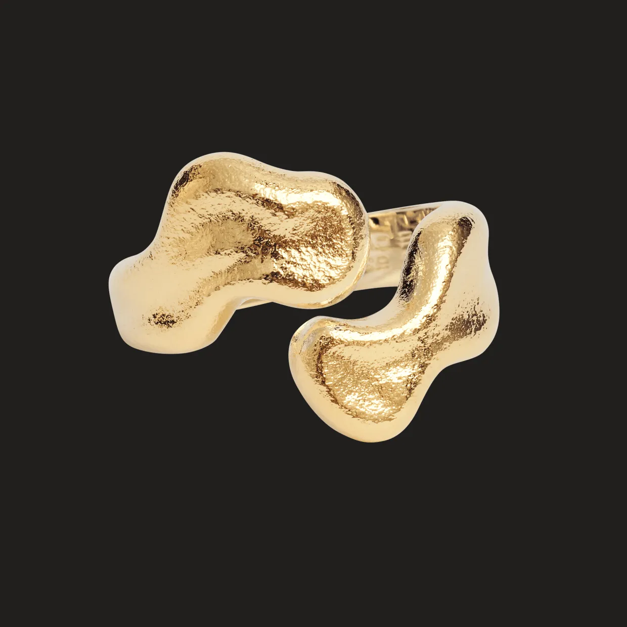 Ringen er lavet i massiv 925 forgyldt sterling sølv. forgyldningen er en 22 karat forgyldning med en en rustik overflade.