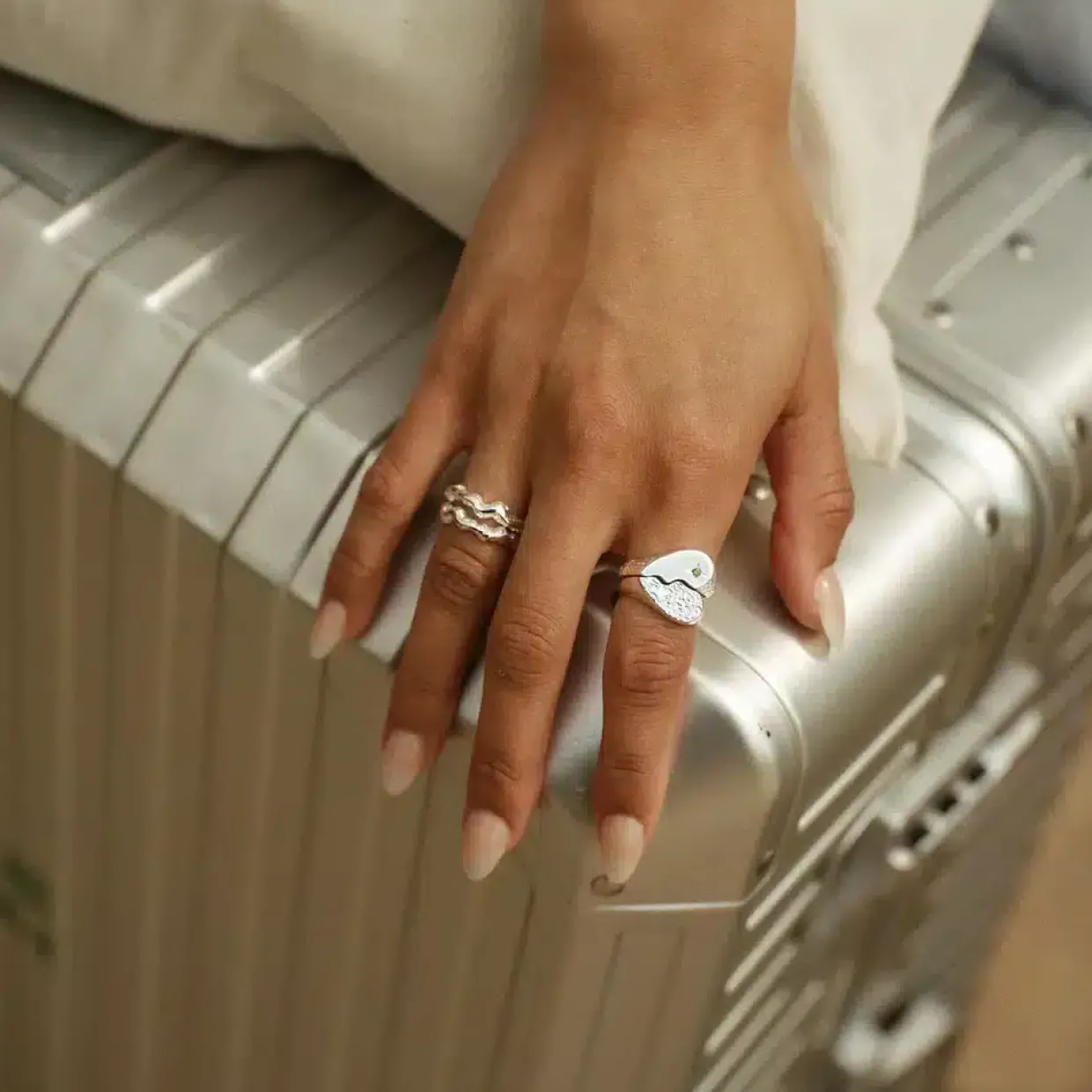 Ringen er lavet som et halvt hjerte så den kan bruges for sig selv eller sættes sammen med en den anden halvdel i sølv eller sølvforgyldt.