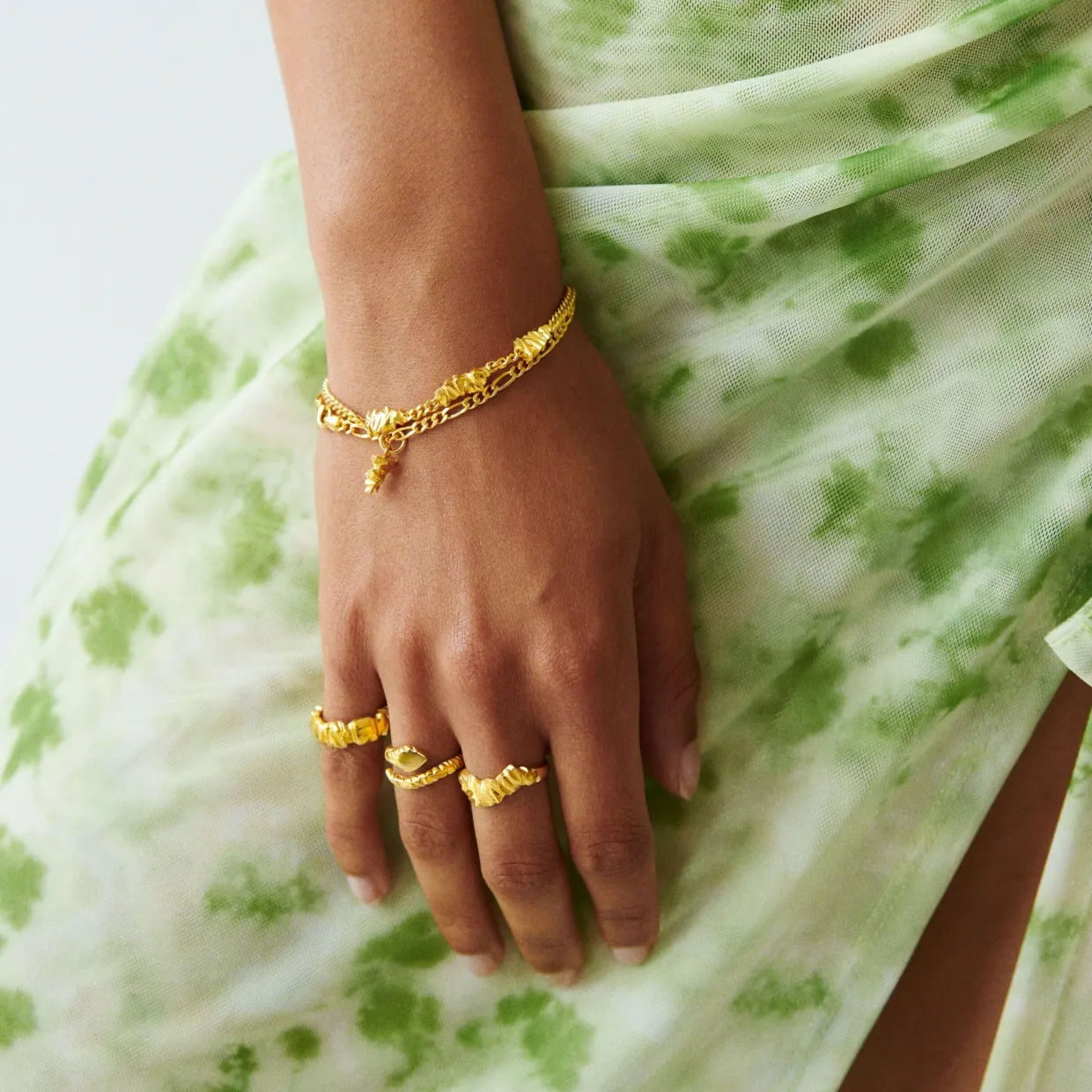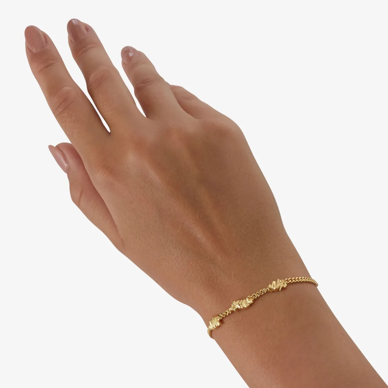 Armbåndet er fremstillet i sterlingsølv (925) og forgyldt med 22 karat guld, hvilket giver en varm, gylden glans, der smukt fremhæver panzerkædens karakteristiske struktur. Hver led er nøje formet for at skabe en perfekt balance mellem tyngde og komfort, så armbåndet både føles luksuriøst og behageligt at bære.