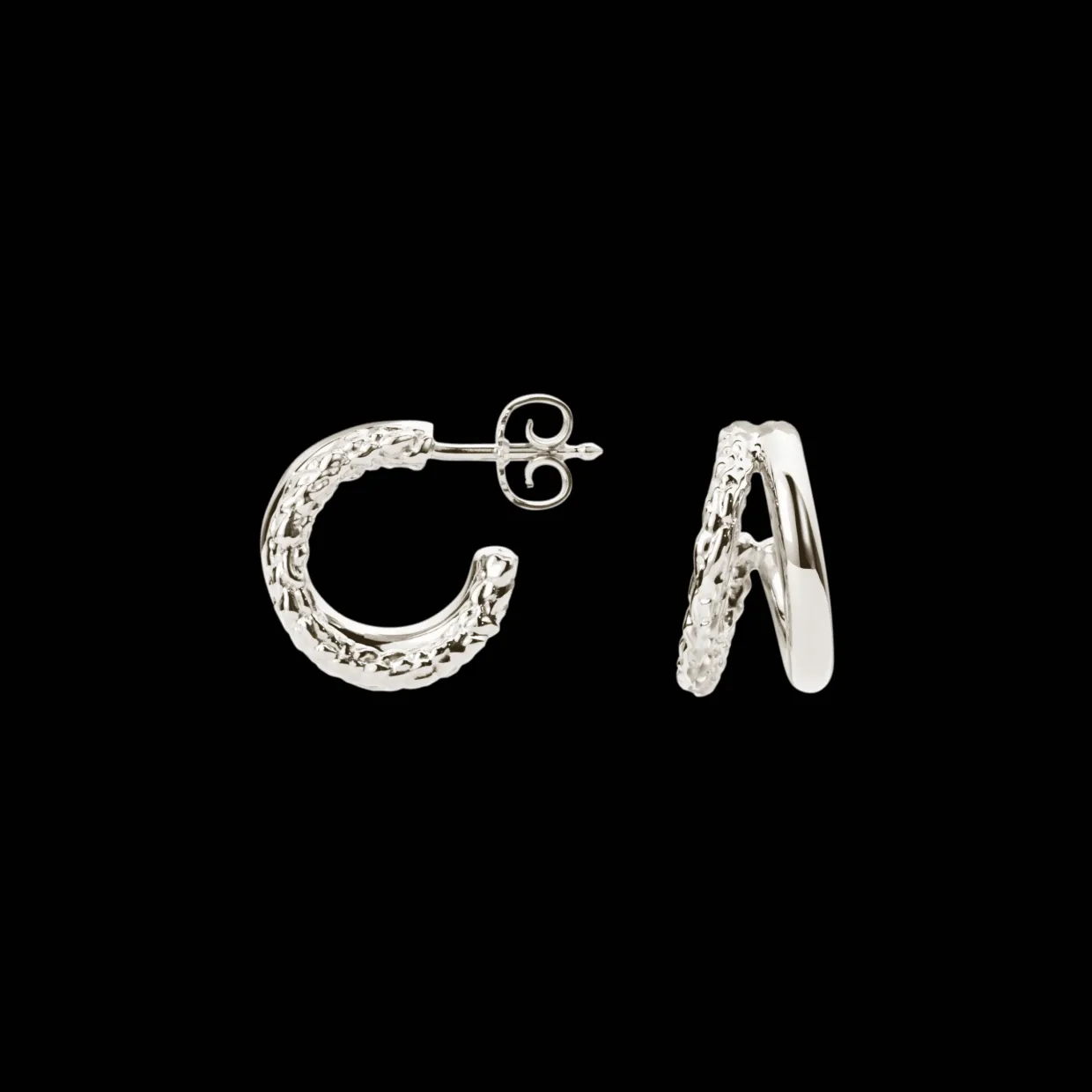 Designet er en del af den populære Essentia-kollektionen, hvor rå detaljer møder bløde linjer og skaber et tidløst look med karakter. Øreringene er perfekte til både hverdagsbrug og festlige anledninger – alene eller i kombination med andre smykker.