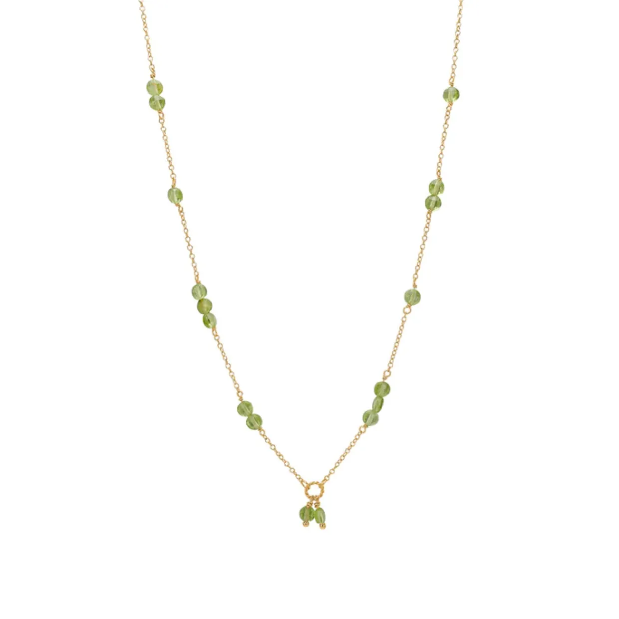 Denne smukke halskæde er fremstillet i guld belagt sterling sølv. Halskæden er besat med grønne peridot ædelstene som er facet slebne. Halskæden måler 38+2,5+2,5 cm i en justerbar lukning.