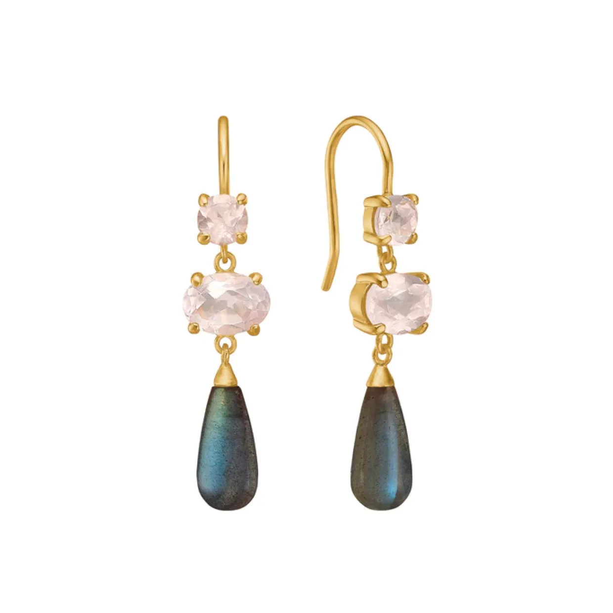 Disse smukke ørehængere er fremstillet i sterling sølv og belagt med rød guld. Ørehængerne er sat med to rosa kvarts i grabbe fatning og en dråbeformet labadorit som hænger fra disse.