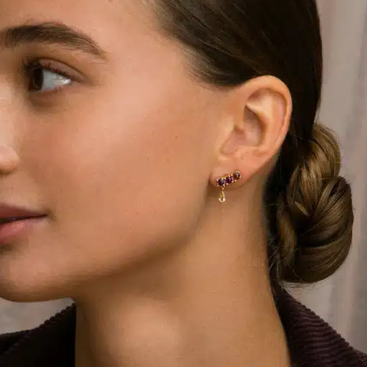 Elegante øreringe med tre stk. Ametyst og en champange kvarts isat i hver ørestik.