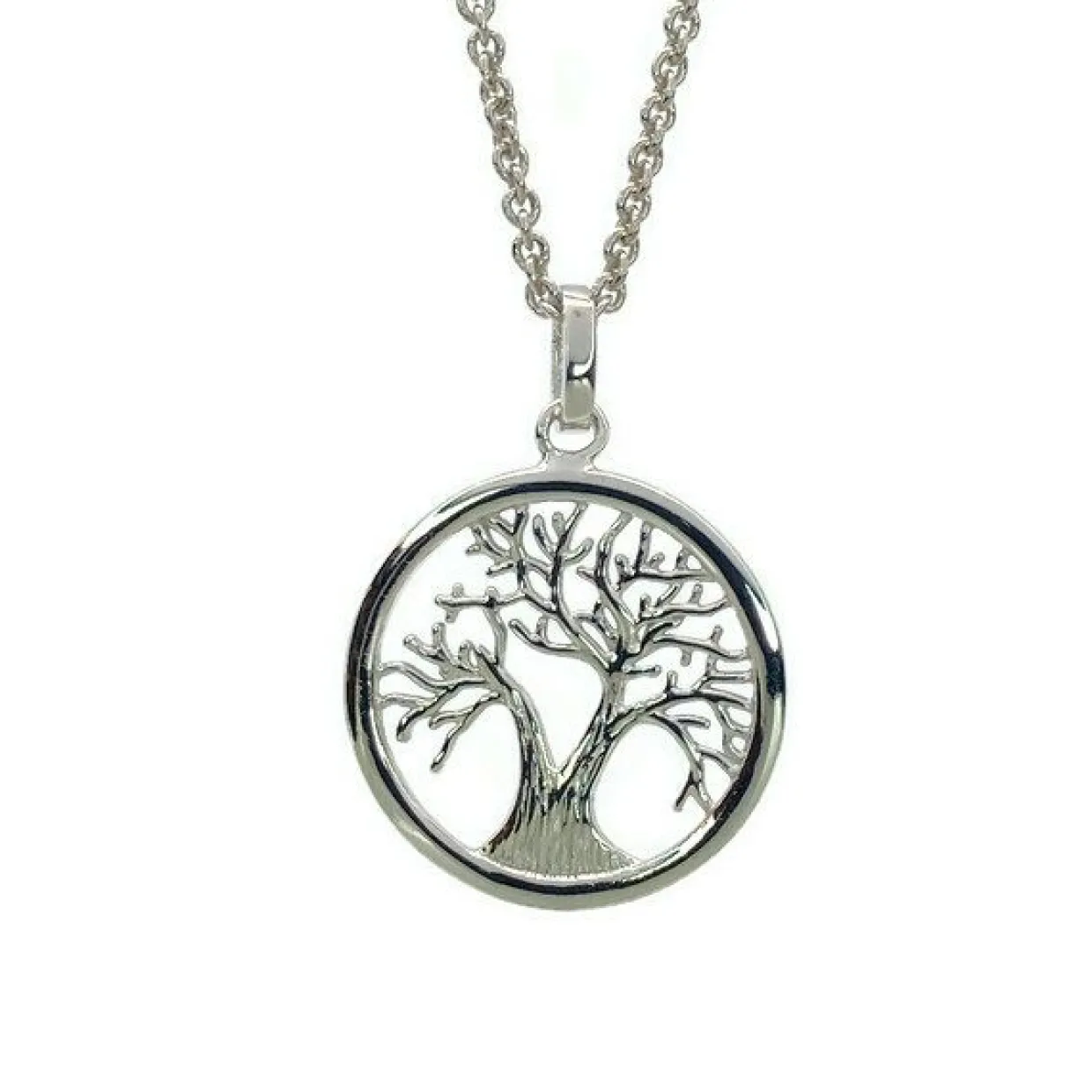 Sølv halskæde med vedhæng som livetstræ. Vedhænget livetstræ måler 16 mm i diameter. Kæden er en rund anker kæde i tråd 0,40 mm og en længde på 45 cm.