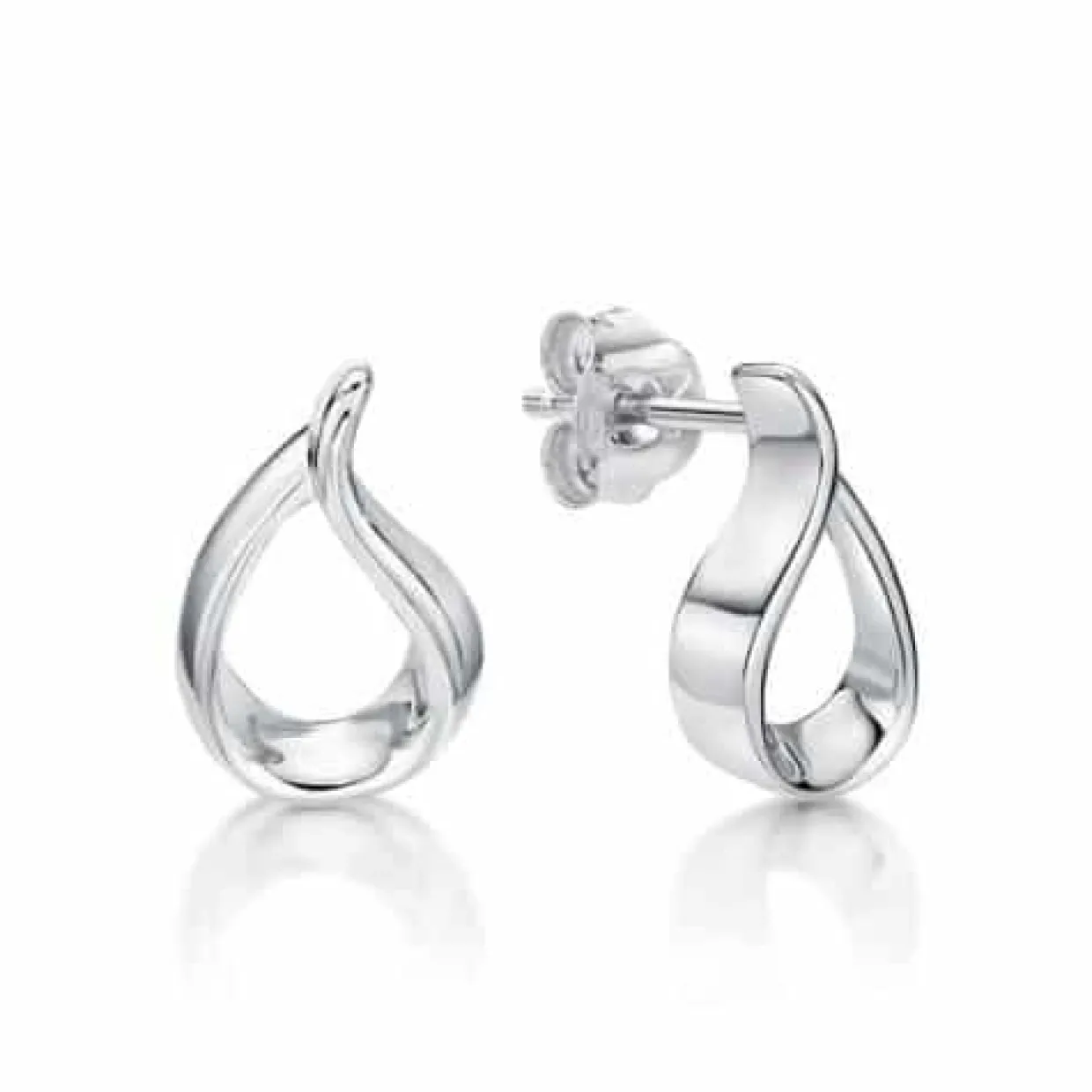 Sølv øreringe på stik som er dråbe formet. Øreringene måler 9 mm bredden og 13 mm i højden. Øreringene er blanke med en rhodium overflade.