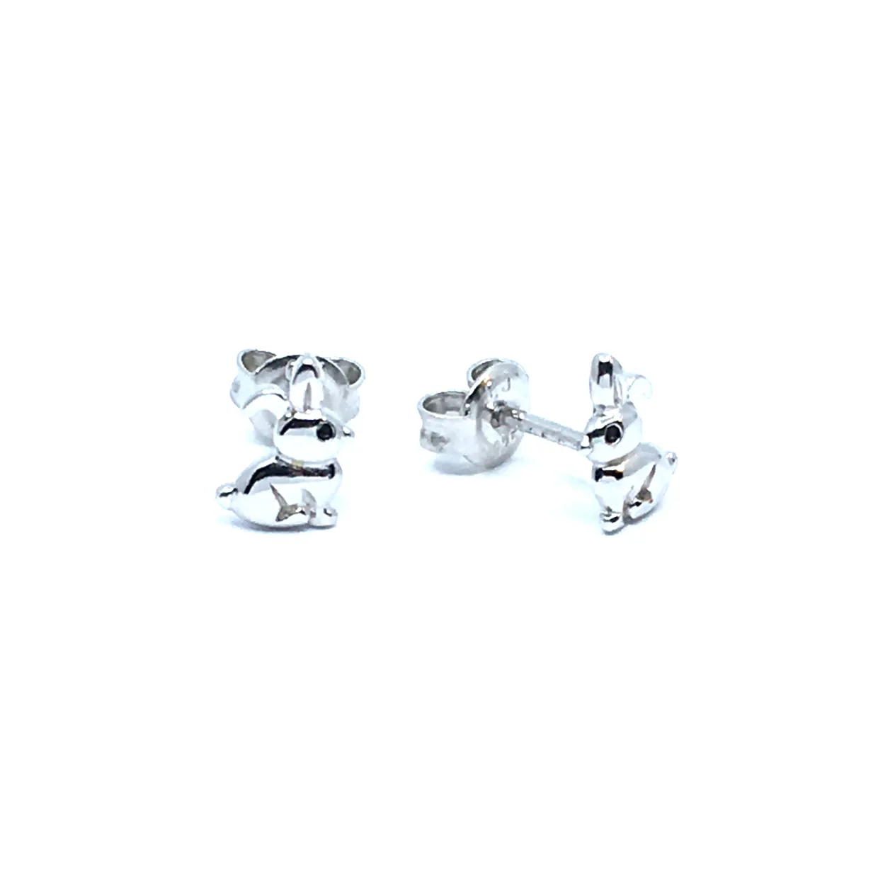 Sølv børne øreringe på stik med kanin. Øreringe er rhodineret så de holder sig pænere i længere tid. Øjnene på kaninen er med ægte emalje.
