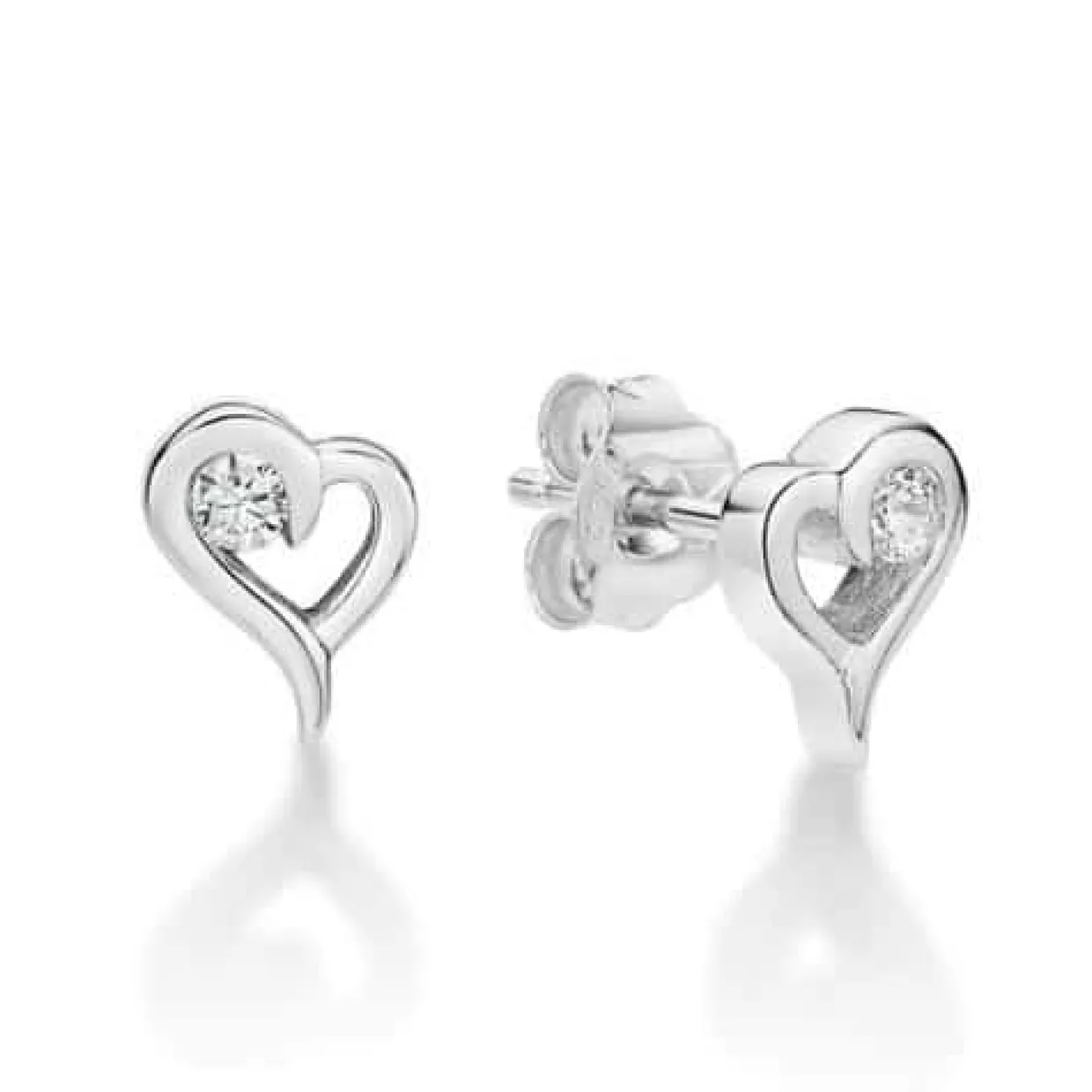 Sølv øreringe på stik med åben hjerte. I hjertet sidder en syntetisk zirkonia. Øreringene er rhodineret så de holder sig pænere i længere tid.