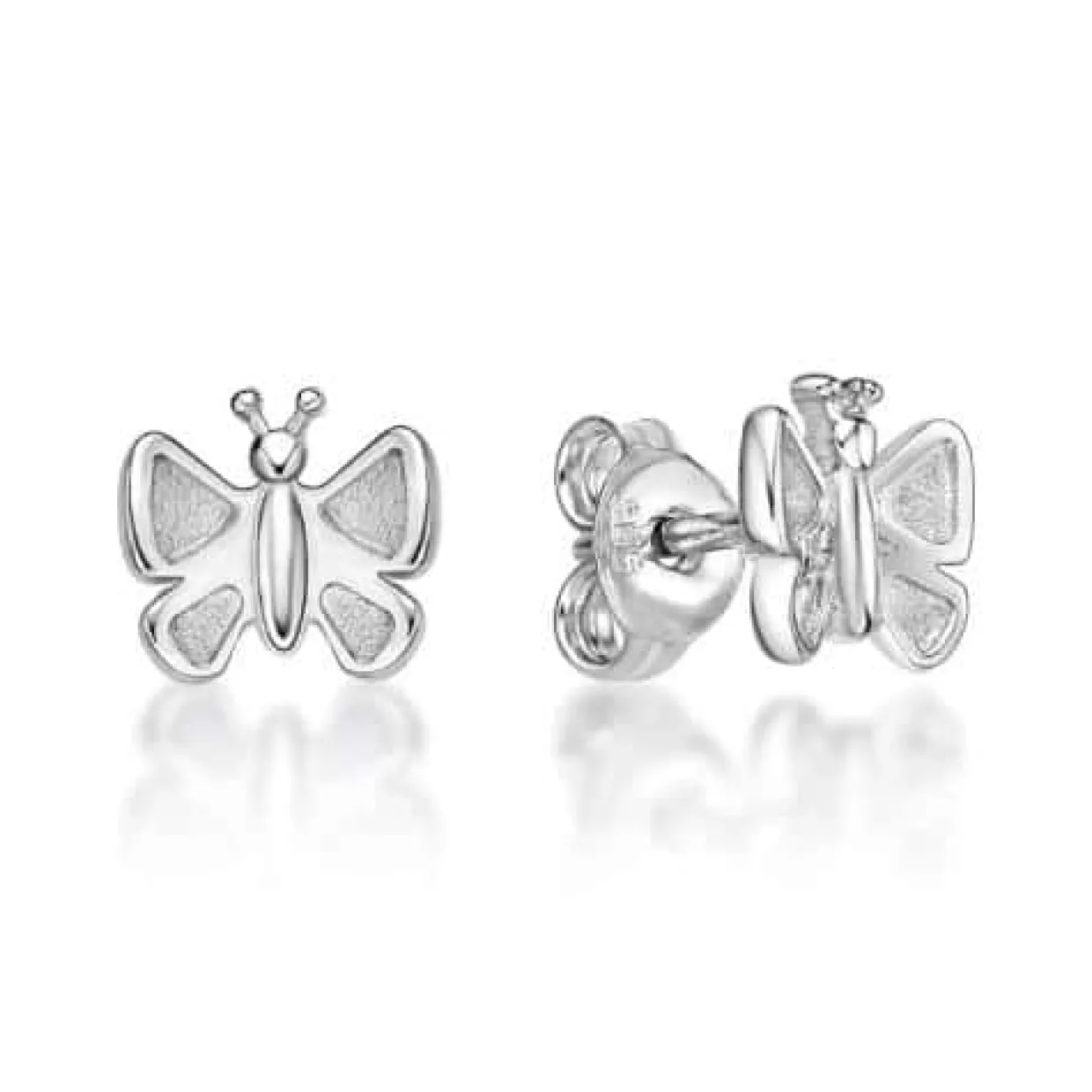 Sølv øreringe på stik med sommerfugl uden sten. Øreringene har fået en rhodium overflade, så de holder sig pænere i længere tid.