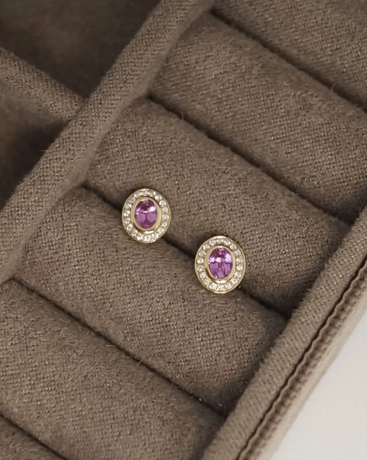 I hver ørestik sidder en pink safir omkranset af 0,045 carat brillanter i kvaliteten w/si.