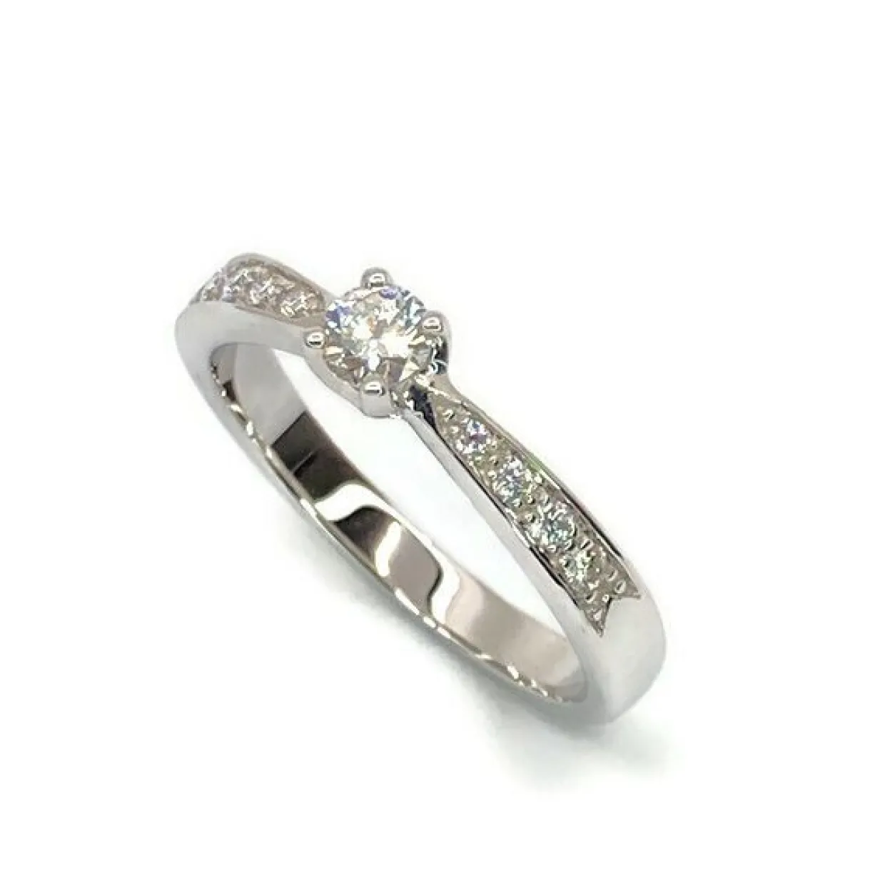 14 karat hvidguld ring med brillanter. Brillanterne er i alt på 0,31 carat i kvaliteten wesselton/si. Midter brillanten sidder i en 4 grabbet fatning med 4 brillanter på hver side.