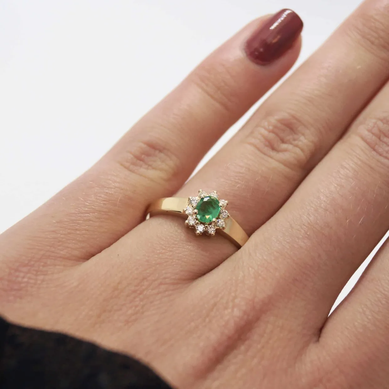 I ringen sidder en grøn smaragd omkranset af 0,15 ct brillanter i kvaliteten w/si.