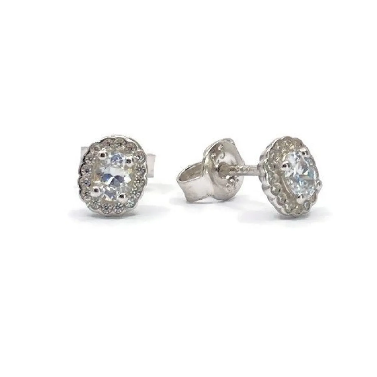 Sølv ørestik med syntetiske zirkonia. Ørestikkene er lavet som rosét med en stor zirkonia i midten og en masse små rundt om. Ørestikkerne er rhodineret.