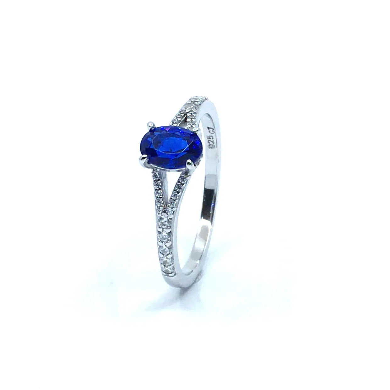Skøn ring i sterling sølv, med en masse funklende sten der lyser flot op omkring den syntetiske blå safirsten i midten af ringen.