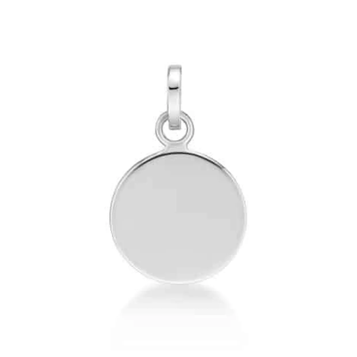 Sølv vedhæng med rund plade. Pladen måler 12 mm i diameter og er uden kæde. Vedhænget er rhodineret så det holder sig pænere i længere tid.