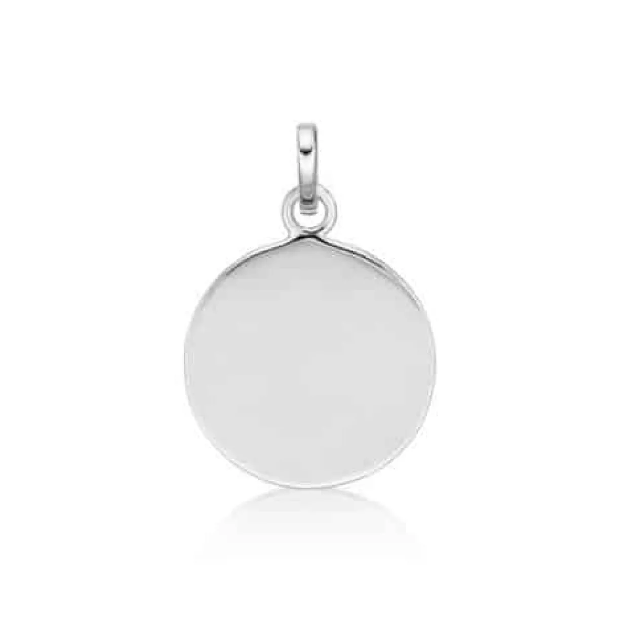 Sølv vedhæng med rund plade. Pladen er med blank oveflade og måler 18 mm i diameter. Vedhænget er uden kæde, men som kan tilkøbes.