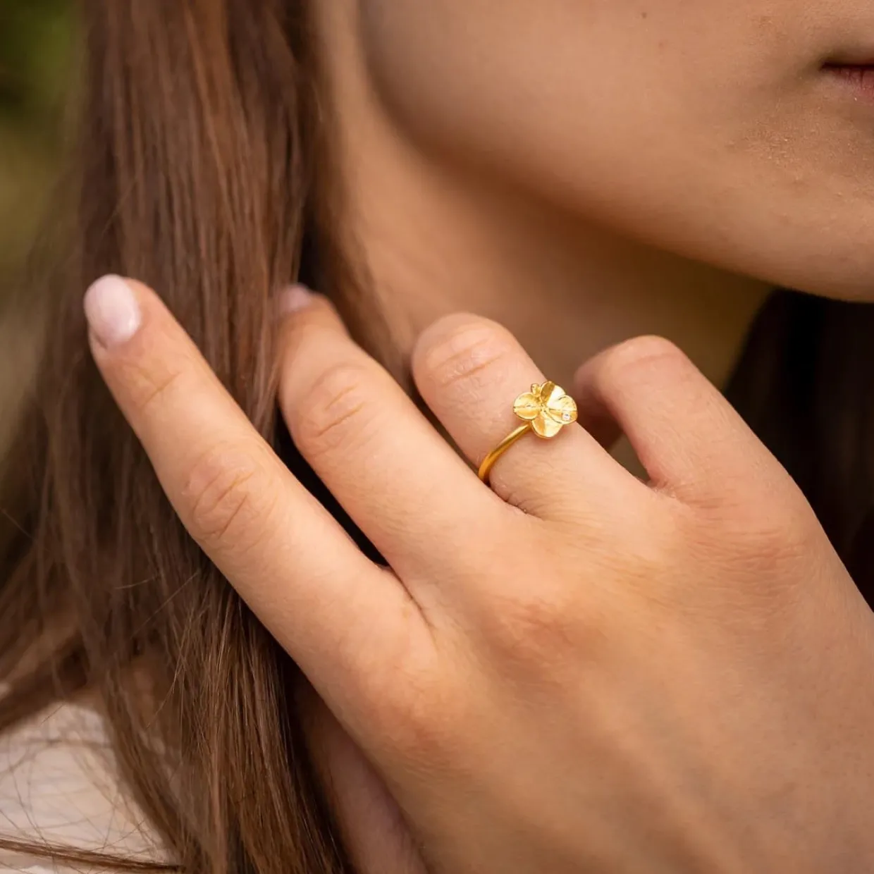 Sølv forgyldt ring med firkløver. Ringen er forgyldt med en 22 karat forgyldning. Firkløveren måler 9 mm i bredden og 8 mm i højden.